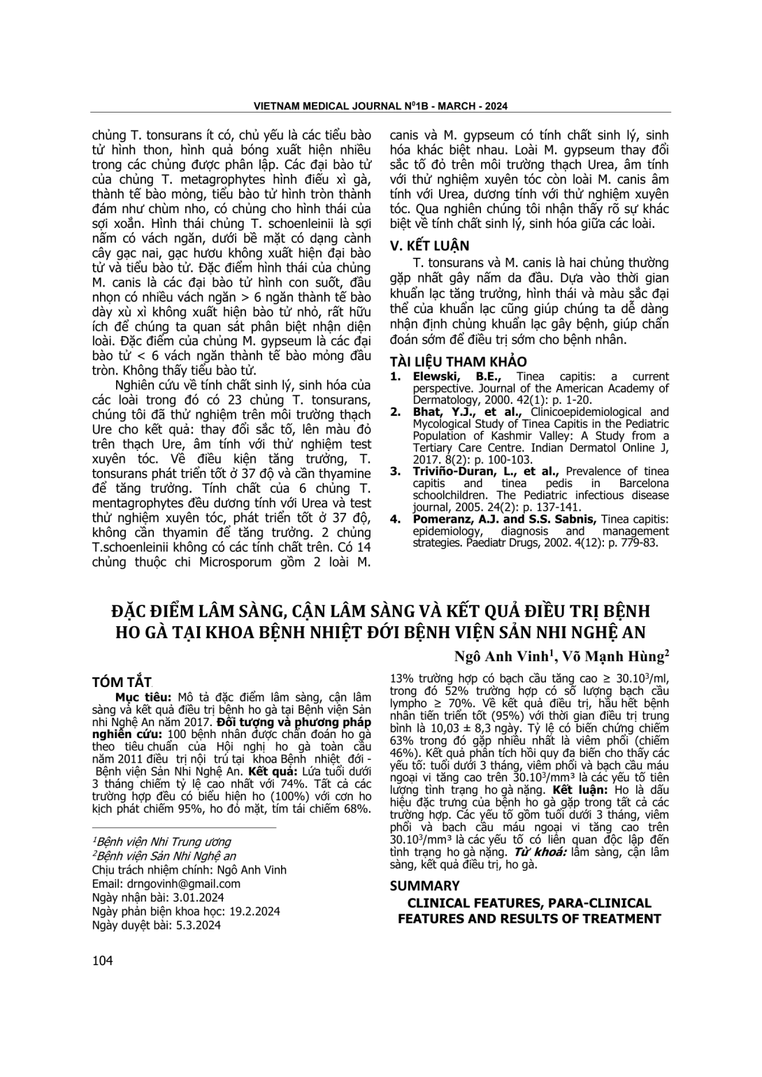 Mô tả đặc điểm lâm sàng, cận lâm sàng và kết quả điều trị bệnh ho gà tại Bệnh viện Sản nhi Nghệ An năm 2017. Đối tượng và phương pháp nghiên cứu: 100 bệnh nhân được chẩn đoán ho gà theo tiêu chuẩn của Hội nghị ho gà toàn cầu năm 2011 điều trị nội trú tại khoa Bệnh nhiệt đới - Bệnh viện Sản Nhi Nghệ An. Kết quả: Lứa tuổi dưới 3 tháng chiếm tỷ lệ cao nhất với 74%. Tất cả các trường hợp đều có biểu hiện ho (100%) với cơn ho kịch phát chiếm 95%, ho đỏ mặt, tím tái chiếm 68%. 13% trường hợp có bạch cầu tăng cao ≥ 30.103/ml, trong đó 52% trường hợp có số lượng bạch cầu lympho ≥ 70%. Về kết quả điều trị, hầu hết bệnh nhân tiến triển tốt (95%) với thời gian điều trị trung bình là 10,03 ± 8,3 ngày. Tỷ lệ có biến chứng chiếm 63% trong đó gặp nhiều nhất là viêm phổi (chiếm 46%). Kết quả phân tích hồi quy đa biến cho thấy các yếu tố: tuổi dưới 3 tháng, viêm phổi và bạch cầu máu ngoại vi tăng cao trên 30.103/mm³ là các yếu tố tiên lượng tình trạng ho gà nặng. Kết luận: Ho là dấu hiệu đặc trưng của bệnh ho gà gặp trong tất cả các trường hợp. Các yếu tố gồm tuổi dưới 3 tháng, viêm phổi và bạch cầu máu ngoại vi tăng cao trên 30.103/mm³ là các yếu tố có liên quan độc lập đến tình trạng ho gà nặng.