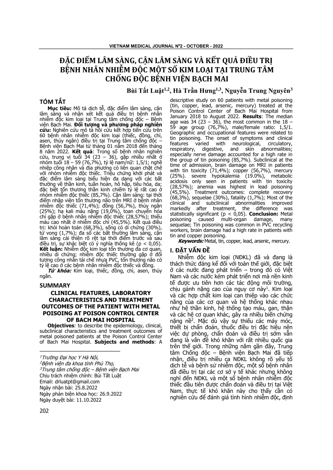 Mô tả dịch tễ, đặc điểm lâm sàng, cận lâm sàng và nhận xét kết quả điều trị bệnh nhân nhiễm độc kim loại tại Trung tâm chống độc – Bệnh viện Bạch Mai. Đối tượng và phương pháp nghiên cứu: Nghiên cứu mô tả hồi cứu kết hợp tiến cứu trên 60 bệnh nhân nhiễm độc kim loại (thiếc, đồng, chì, asen, thủy ngân) điều trị tại Trung tâm chống độc – Bệnh viện Bạch Mai từ tháng 01 năm 2018 đến tháng 8 năm 2022. Kết quả: Trong số bệnh nhân nghiên cứu, trung vị tuổi 34 (23 – 36), gặp nhiều nhất ở nhóm tuổi 18 – 59 (76,7%), tỷ lệ nam/nữ: 1,5/1; nghề nhiệp công nhân và địa phương có liên quan chặt chẽ với nhóm nhiễm độc thiếc. Triệu chứng khởi phát và đặc điểm lâm sàng biểu hiện đa dạng với các bất thường về thần kinh, tuần hoàn, hô hấp, tiêu hóa, da; đặc biệt tổn thương thần kinh chiếm tỷ lệ rất cao ở nhóm nhiễm độc thiếc (85,7%). Cận lâm sàng: tại thời điểm nhập viện tổn thương não trên MRI ở bệnh nhân nhiễm độc thiếc (71,4%); đồng (56,7%), thủy ngân (25%); hạ kali máu nặng (19,0%), toan chuyển hóa chỉ gặp ở bệnh nhân nhiễm độc thiếc (28,57%); thiếu máu cao nhất ở nhiễm độc chì (45,5%). Kết quả điều trị: khỏi hoàn toàn (68,3%), sống có di chứng (30%), tử vong (1,7%); đa số các bất thường lâm sàng, cận lâm sàng cải thiện rõ rệt tại thời điểm trước và sau điều trị, sự khác biệt có ý nghĩa thống kê (p < 0,05). Kết luận: Nhiễm độc kim loại tổn thương đa cơ quan, nhiều di chứng; nhiễm độc thiếc thường gặp ở đối tượng công nhân tái chế nhựa PVC, tổn thương não có tỷ lệ cao ở các bệnh nhân nhiễm độc thiếc và đồng.