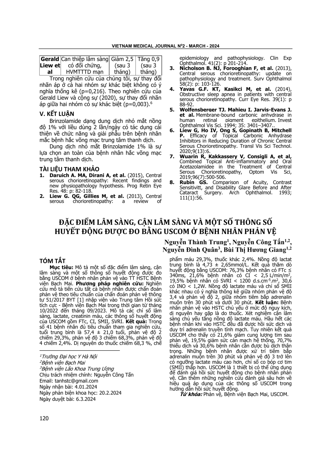 Mô tả một số đặc điểm lâm sàng, cận lâm sàng và một số thông số huyết động được đo bằng USCOM ở bệnh nhân phản vệ vào TT HSTC Bệnh viện Bạch Mai. Phương pháp nghiên cứu: Nghiên cứu mô tả tiến cứu tất cả bệnh nhân được chẩn đoán phản vệ theo tiêu chuẩn của chẩn đoán phản vệ thông tư 51/2017 BYT [1] nhập viện vào Trung tâm Hồi sức tích cực - Bệnh viện Bạch Mai trong thời gian từ tháng 10/2022 đến tháng 09/2023. Mô tả các chỉ số lâm sàng, lactate, creatinin máu, các thông số huyết động của USCOM gồm FTc, CI, SMII, SVRI. Kết quả: Trong số 41 bệnh nhân đủ tiêu chuẩn tham gia nghiên cứu, tuổi trung bình là 57,4 ± 21,0 tuổi, phản vệ độ 2 chiếm 29,3%, phản vệ độ 3 chiếm 68,3%, phản vệ độ 4 chiếm 2,4%. Dị nguyên do thuốc chiếm 68,3 %, chế phẩm máu 29,3%, thuốc khác 2,4%. Nồng độ lactat trung bình là 4,73 ± 2,65mmol/L. Kết quả thăm dò huyết động bằng USCOM: 76,3% bệnh nhân có FTc ≤ 340ms, 21,6% bệnh nhân có CI < 2,5 L/min/m2, 19,5% bệnh nhân có SVRI < 1200 d.s.cm-5.m2, 30,6 có INO < 1,2W. Nồng độ lactate máu và chỉ số SMII khác nhau có ý nghĩa thông kê giữa nhóm phản vệ độ 3,4 và phản vệ độ 2, giữa nhóm tiêm bắp adrenalin muộn trên 30 phút và dưới 30 phút. Kết luận: Bệnh nhân phản vệ vào HSTC chủ yếu ở mức độ nguy kịch, dị nguyên hay gặp là do thuốc. Xét nghiệm cận lâm sàng chủ yếu tăng nồng độ lactate máu. Hầu hết các bệnh nhân khi vào HSTC đều đã được hồi sức dịch và duy trì adrenalin truyền tĩnh mạch. Tuy nhiên kết quả USCOM cho thấy có 21,6% giảm cung lượng tim sau phản vệ, 19,5% giảm sức cản mạch hệ thống, 70,7% thiếu dịch và 30,6% bệnh nhân cần được bù dịch thận trọng. Những bệnh nhân được xử trí tiêm bắp adrenalin muộn trên 30 phút và phản vệ độ 3 trở lên có ngưỡng lactate máu cao hơn, chỉ số co bóp cơ tim (SMII) thấp hơn. USCOM là 1 thiết bị có thể ứng dụng để đánh giá hồi sức huyết động cho bệnh nhân phản vệ. Cần thêm những nghiên cứu đánh giá sâu hơn về hiệu quả áp dụng của các thông số USCOM trong hướng dẫn hồi sức huyết động.