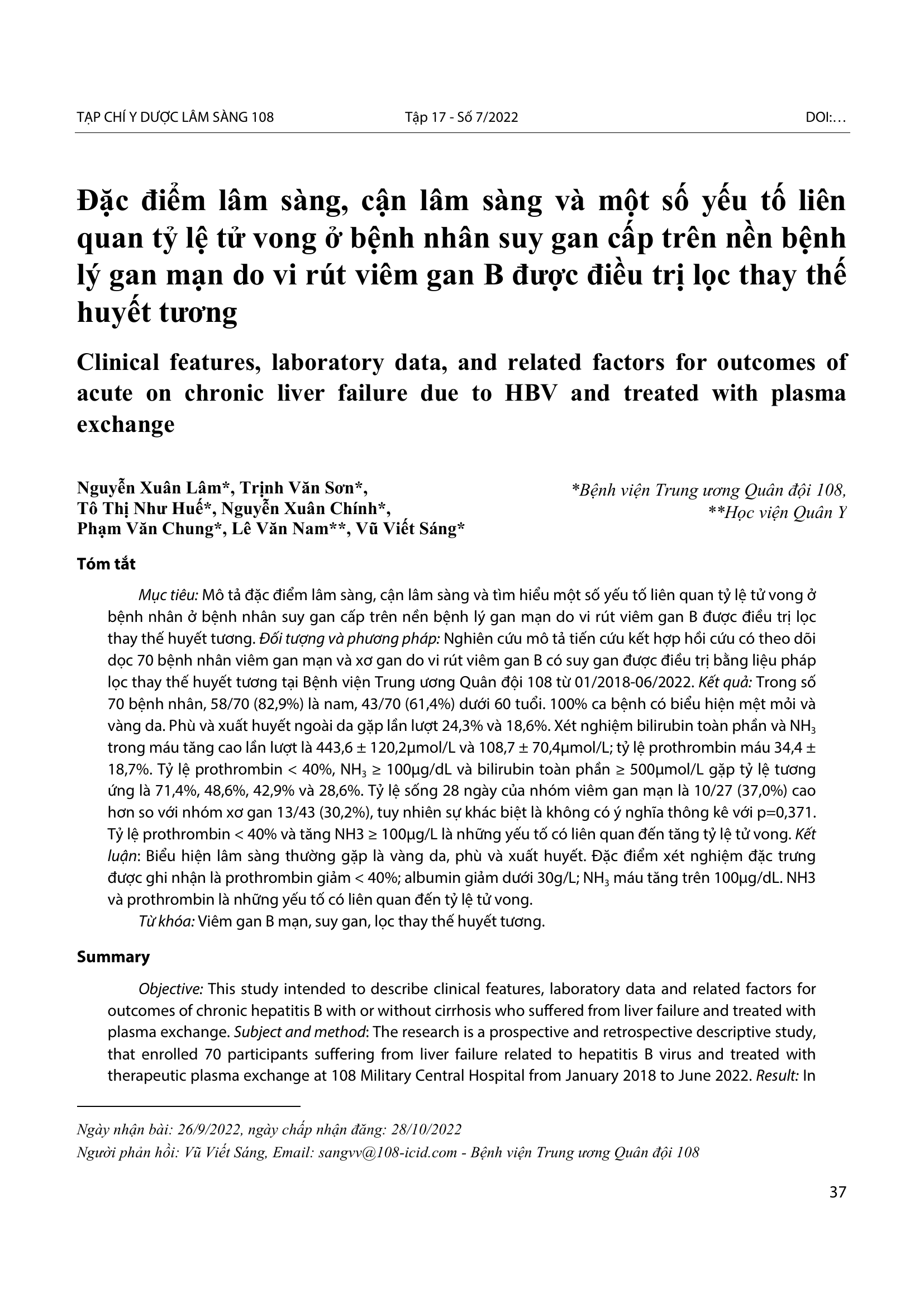 Mô tả đặc điểm lâm sàng, cận lâm sàng và tìm hiểu một số yếu tố liên quan tỷ lệ tử vong ở bệnh nhân ở bệnh nhân suy gan cấp trên nền bệnh lý gan mạn do vi rút viêm gan B được điều trị lọc thay thế huyết tương. Đối tượng và phương pháp: Nghiên cứu mô tả tiến cứu kết hợp hồi cứu có theo dõi dọc 70 bệnh nhân viêm gan mạn và xơ gan do vi rút viêm gan B có suy gan được điều trị bằng liệu pháp lọc thay thế huyết tương tại Bệnh viện Trung ương Quân đội 108 từ 01/2018-06/2022. Kết quả: Trong số 70 bệnh nhân, 58/70 (82,9%) là nam, 43/70 (61,4%) dưới 60 tuổi. 100% ca bệnh có biểu hiện mệt mỏi và vàng da. Phù và xuất huyết ngoài da gặp lần lượt 24,3% và 18,6%. Xét nghiệm bilirubin toàn phần và NH3 trong máu tăng cao lần lượt là 443,6 ± 120,2µmol/L và 108,7 ± 70,4µmol/L; tỷ lệ prothrombin máu 34,4 ± 18,7%. Tỷ lệ prothrombin < 40%, NH3 ≥ 100µg/dL và bilirubin toàn phần ≥ 500µmol/L gặp tỷ lệ tương ứng là 71,4%, 48,6%, 42,9% và 28,6%. Tỷ lệ sống 28 ngày của nhóm viêm gan mạn là 10/27 (37,0%) cao hơn so với nhóm xơ gan 13/43 (30,2%), tuy nhiên sự khác biệt là không có ý nghĩa thông kê với p=0,371. Tỷ lệ prothrombin < 40% và tăng NH3 ≥ 100µg/L là những yếu tố có liên quan đến tăng tỷ lệ tử vong. Kết luận: Biểu hiện lâm sàng thường gặp là vàng da, phù và xuất huyết. Đặc điểm xét nghiệm đặc trưng được ghi nhận là prothrombin giảm < 40%; albumin giảm dưới 3