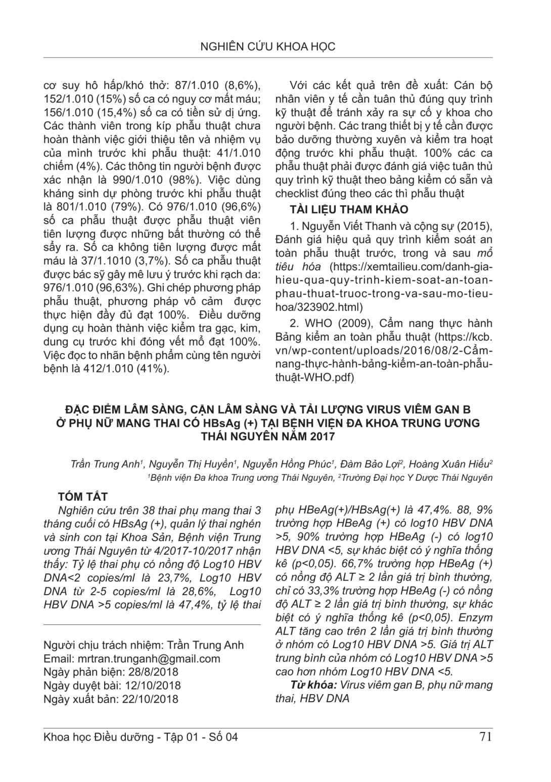 Nghiên cứu trên 38 thai phụ mang thai 3 tháng cuối có HBsAg (+), quản lý thai nghén và sinh con tại Khoa Sản, Bệnh viện Trung ương Thái Nguyên từ 4/2017-10/2017 nhận thấy Tỷ lệ thai phụ có nồng độ Log10 HBV DNA<2 copies/ml là 23,7%, Log10 HBV DNA từ 2-5 copies/ml là 28,6%, Log10 HBV DNA >5 copies/ml là 47,4%, tỷ lệ thai phụ HBeAg(+)/HBsAg(+) là 47,4%. 88, 9% trường hợp HBeAg (+) có log10 HBV DNA >5, 90% trường hợp HBeAg (-) có log10 HBV DNA <5, sự khác biệt có ý nghĩa thống kê (p<0,05). 66,7% trường hợp HBeAg (+) có nồng độ ALT ≥ 2 lần giá trị bình thường, chỉ có 33,3% trường hợp HBeAg (-) có nồng độ ALT ≥ 2 lần giá trị bình thường, sự khác biệt có ý nghĩa thống kê (p<0,05). Enzym ALT tăng cao trên 2 lần giá trị bình thường ở nhóm có Log10 HBV DNA >5. Giá trị ALT trung bình của nhóm có Log10 HBV DNA >5 cao hơn nhóm Log10 HBV DNA <5.