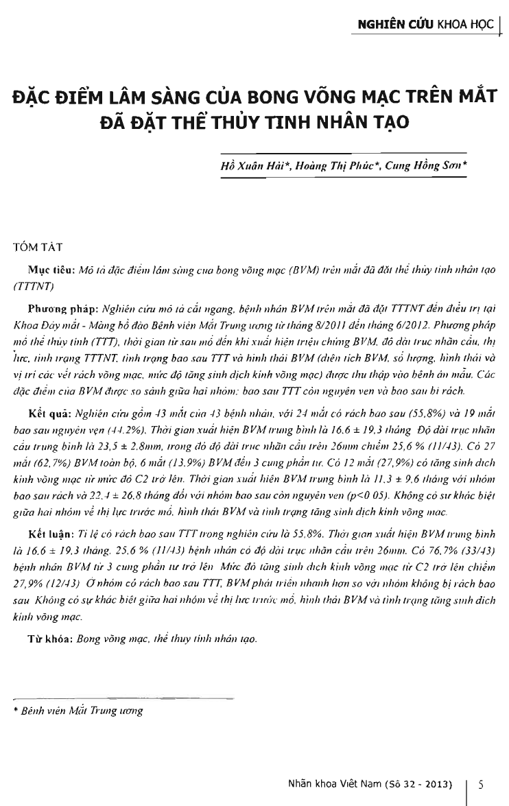 Purpose: To evaluate the clinical features of pseudophakic retinal detachment. Methods: a cross-sectional study, 43 eyes of 43 pseudophakic retinal detachment patients consecutively from 8/2011 to 6/2012 at Retinal department, VNIO. Type of cataract extraction, the interval from cataract surgery to retinal detachment, axial length (AL), VA, IOL and posterior capsule situations, clinical features of retinal detachment (area of retinal detachment, numbers and features of tears, vitreous retinal proliferation (VRP)) were noted and compared among the two groups: ruptured posterior capsule and the non-ruptured group. Results: 43 eyes of 43 pseudophakic retinal detachment patients with ruptured posterior capsule: 24/43 (55.8 percent), non- ruptured posterior capsule: 19/43 (44.2 percent) Retinal detachment developed after an average of 16.6 + or - 19.3 months. Mean of AL: 23.5 + or - 2.8mm, 11/43 eyes with AL 26mm (25.6 percent). 27 eyes (62.7 percent) total retinal detachment, 6 eyes (13.9 percent) retinal detachment in 3 quadrants. 12 eyes (27.9 percent) with VRP or = grade C2. Retinal detachment developed after an average of 11.3 + or - 9.6 months in the ruptured group, and an average of 22.4 + or - 26.8 months in the non-ruptured group (p0.05). There were no significant difference between both groups in the visual acuity, clinical features of retinal detachment, VRP degres. Conclusions: 24/43 eyes (55.8 percent) have ruptured posterior capsule. Retinal detachment developed after an average of 16.6 + or - 19.3 months. 11/43 eyes with AL 26mmm (25.6 percent). 33 eyes (76.7 percent) have retinal detachment area more than 3 quadrants. 12 eyes (27. 9 percent) with VRP or = C2. The development of retinal detachment was earlier in ruptured group than in the non-ruptured group. There were no significant difference between both groups in the visual acuity, clinical features of retinal detachment, VRP.