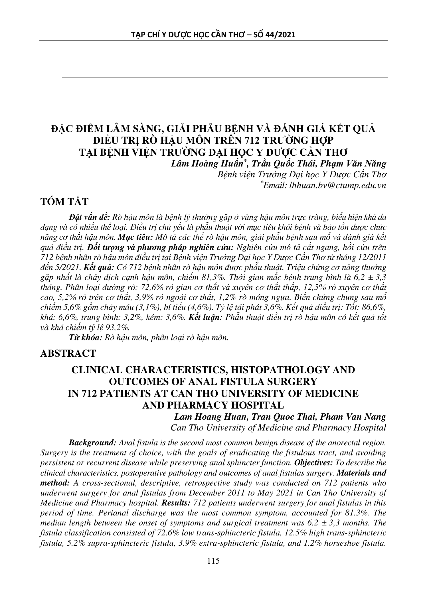 Rò hậu môn là bệnh lý thường gặp ở vùng hậu môn trực tràng, biểu hiện khá đa dạng và có nhiều thể loại. Điều trị chủ yếu là phẫu thuật với mục tiêu khỏi bệnh và bảo tồn được chức năng cơ thắt hậu môn. Mục tiêu: Mô tả các thể rò hậu môn, giải phẫu bệnh sau mổ và đánh giá kết quả điều trị. Đối tượng và phương pháp nghiên cứu: Nghiên cứu mô tả cắt ngang, hồi cứu trên 712 bệnh nhân rò hậu môn điều trị tại Bệnh viện Trường Đại học Y Dược Cần Thơ từ tháng 12/2011 đến 5/2021. Kết quả: Có 712 bệnh nhân rò hậu môn được phẫu thuật. Triệu chứng cơ năng thường gặp nhất là chảy dịch cạnh hậu môn, chiếm 81,3%. Thời gian mắc bệnh trung bình là 6,2 ± 3,3 tháng. Phân loại đường rò: 72,6% rò gian cơ thắt và xuyên cơ thắt thấp, 12,5% rò xuyên cơ thắt cao, 5,2% rò trên cơ thắt, 3,9% rò ngoài cơ thắt, 1,2% rò móng ngựa. Biến chứng chung sau mổ chiếm 5,6% gồm chảy máu (3,1%), bí tiểu (4,6%). Tỷ lệ tái phát 3,6%. Kết quả điều trị: Tốt: 86,6%, khá: 6,6%, trung bình: 3,2%, kém: 3,6%. Kết luận: Phẫu thuật điều trị rò hậu môn có kết quả tốt và khá chiếm tỷ lệ 93,2%.