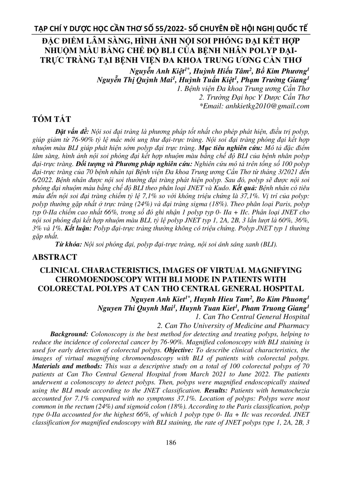 Mô tả đặc điểm lâm sàng, hình ảnh nội soi phóng đại kết hợp nhuộm màu bằng chế độ BLI của bệnh nhân polyp đại-trực tràng. Đối tượng và Phương pháp nghiên cứu: Nghiên cứu mô tả trên tổng số 100 polyp đại-trực tràng của 70 bệnh nhân tại Bệnh viện Đa khoa Trung ương Cần Thơ từ tháng 3/2021 đến 6/2022. Bệnh nhân được nội soi thường đại tràng phát hiện polyp. Sau đó, polyp sẽ được nội soi phóng đại nhuộm màu bằng chế độ BLI theo phân loại JNET và Kudo. Kết quả: Bệnh nhân có tiêu máu đến nội soi đại tràng chiếm tỷ lệ 7,1% so với không triệu chứng là 37,1%. Vị trí của polyp: polyp thường gặp nhất ở trực tràng (24%) và đại tràng sigma (18%). Theo phân loại Paris, polyp typ 0-IIa chiếm cao nhất 66%, trong số đó ghi nhận 1 polyp typ 0- IIa + IIc. Phân loại JNET cho nội soi phóng đại kết hợp nhuộm màu BLI, tỷ lệ polyp JNET typ 1, 2A, 2B, 3 lần lượt là 60%, 36%, 3% và 1%. Kết luận: Polyp đại-trực tràng thường không có triệu chứng. Polyp JNET typ 1 thường gặp nhất.