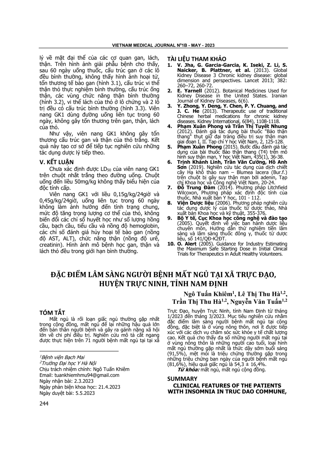 Mất ngủ là rối loạn giấc ngủ thường gặp nhất trong cộng đồng, mất ngủ để lại những hậu quả lớn đến bản thân người bệnh và gây ra gánh nặng xã hội lớn về chi phí điều trị. Nghiên cứu mô tả cắt ngang được thực hiện trên 71 người bệnh mất ngủ tại tại xã Trực Đạo, huyện Trực Ninh, tỉnh Nam Định từ tháng 1/2023 đến tháng 3/2023. Mục tiêu nghiên cứu nhằm đặc điểm lâm sàng người bệnh mất ngủ tại cộng đồng, đặc biệt là ở vùng nông thôn, nơi ít được tiếp xúc với các dịch vụ chăm sóc sức khỏe y tế chất lượng cao. Kết quả cho thấy đa số những người mất ngủ tại ở vùng nông thôn là những người cao tuổi, loại hình mất ngủ thường gặp nhất là thức dậy sớm buổi sáng (91,5%), mệt mỏi là triệu chứng thường gặp trong những triệu chứng ban ngày của người bệnh mất ngủ (81,6%), hiệu quả giấc ngủ là 54,3 ± 16,4%.