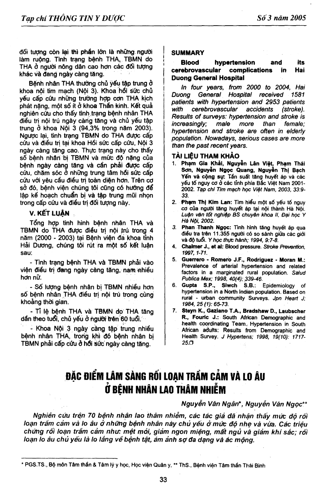 Nghiên cứu đặc điểm lâm sàng rối loạn trầm cảm và lo âu trên 70 bệnh nhân lao thâm nhiễm. Mức độ rối loạn trầm cảm và lo âu ở các đối tượng nghiên cứu chủ yếu ở thể nhẹ và vừa. Các triệu chứng rối loạn trầm cảm chủ yếu: mệt mỏi (87,10% ), giảm ngon miệng (77,10% ), mất ngủ (74,30% ) và giảm khí sắc (71,40% ). Rối loạn lo âu thường gặp là lo lắng (45,7% ), ám ảnh sợ đa dạng (29,90% ) và ác mộng (20,0% ).