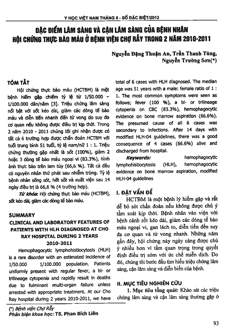 Hemophagocytic Iymphohistiocytosis (HLH) is a rare disorder with an estimated incidence of 1/50,000 - 1/100,000 population. Patients uniformly present with regular fever, a bi- or trilineage cytopenia and rapidly result in deaths due to fulminant multi-organ failure unless arrested with appropriate treatment. At Cho Ray hospital during 2 years 2010-2011, have total of 6 cases with HLH diagnosed. The median age was 51 years with a male: female ratio of 1:1. The most common symptoms were seen as follows; fever (100 percent), a bi- or trilineage cytopenia on CBC (83.3 percent), hemophagocytic evidence on bone marrow aspiration (66.6 percent). The presumed cause of all 6 cases was secondary to infections. After 14 days with modified HLH-04 guidelines, there was a good consequence of 4 cases (66.6 percent) alive and discharged from hospital.