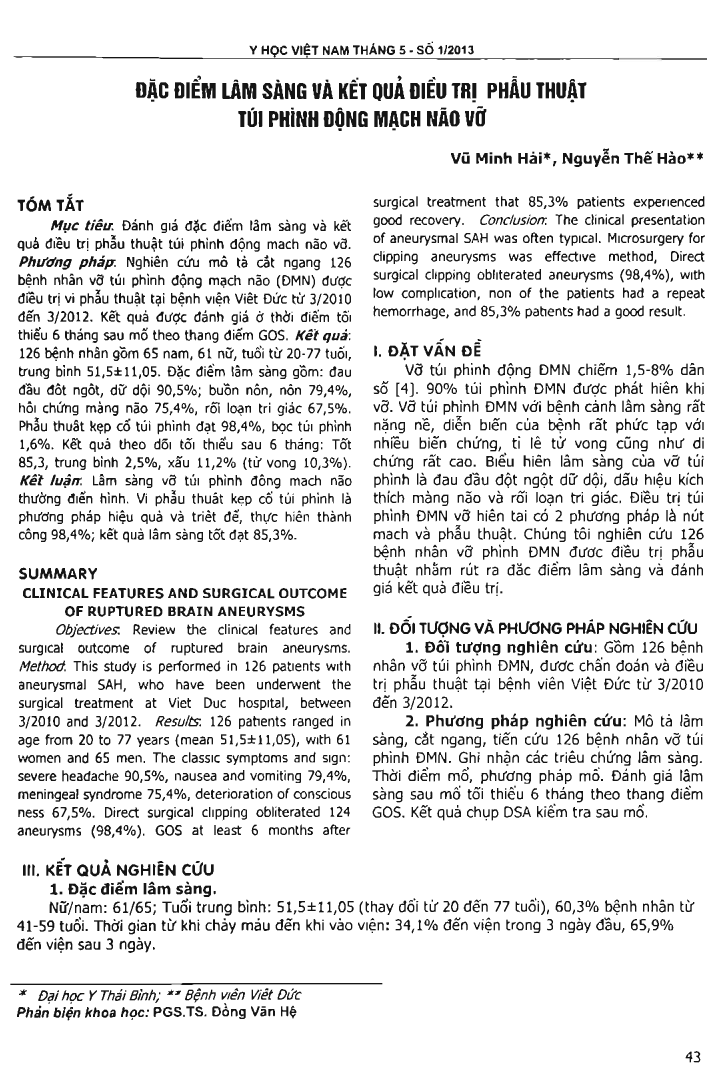 Đặc điểm lâm sàng và kết quả điều trị phẫu thuật túi phình động mạch não vỡ