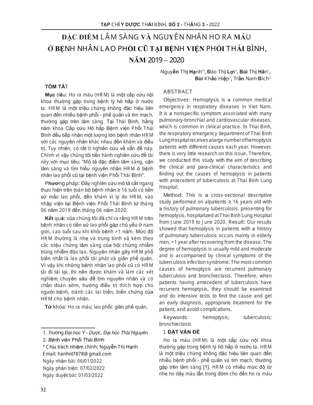 Hemoptysis is a common medical emergency in respiratory diseases in Viet Nam. It is a nonspecifc symptom associated with many pulmonary-bronchial and cardiovascular diseases, which is common in clinical practice. In Thai Binh, the respiratory emergency department of Thai Binh Lung Hospital receives a large number of hemoptysis patients with different causes each year. However, there is very little research on this issue. Therefore, we conducted this study with the aim of describing the clinical and para-clinical characteristics and fnding out the causes of hemoptysis in patients with antecedent of tuberculosis at Thai Binh Lung Hospital. Method: This is a cross-sectional descriptive study performed on alpatients ≥ 16 years old with a history of pulmonary tuberculosis, presenting for hemoptysis, hospitalized at Thai Binh Lung Hospital from June 2019 to June 2020. Result: Our results showed that hemoptysis in patients with a history of pulmonary tuberculosis occurs mainly in elderly men, >1 year after recovering from the disease. The degree of hemoptysis is usually mild and moderate and is accompanied by clinical symptoms of the tuberculosis infection syndrome. The most common causes of hemoptysis are recurrent pulmonary tuberculosis and bronchiectasis. Therefore, when patients having antecedent of tuberculosis have recurrent hemoptysis, they should be examined and do intensive tests to fnd the cause and get an early diagnosis, appropriate treatment for the patient, and avoid complications.
