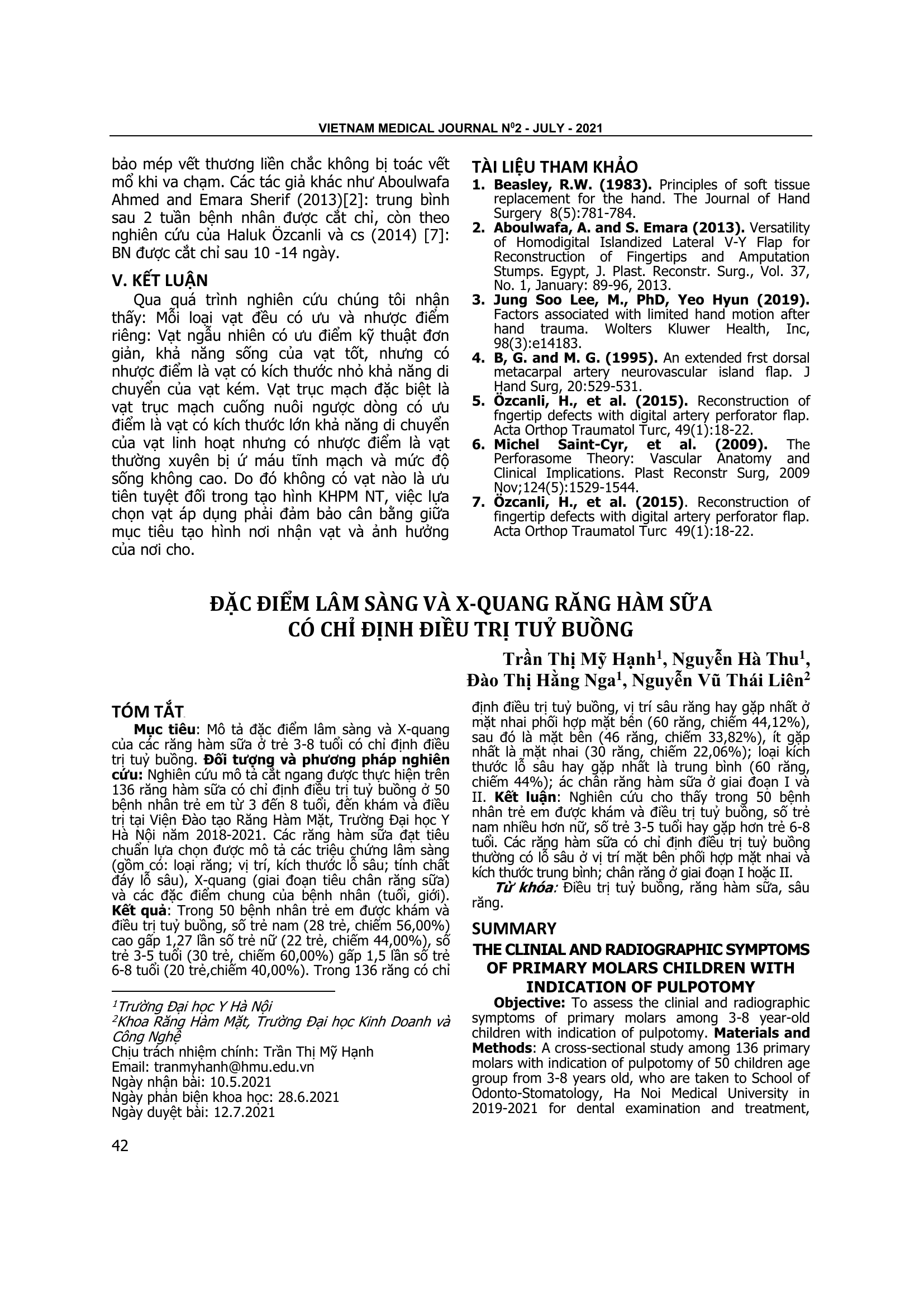 Mô tả đặc điểm lâm sàng và X-quang của các răng hàm sữa ở trẻ 3-8 tuổi có chỉ định điều trị tuỷ buồng. Đối tượng và phương pháp nghiên cứu: Nghiên cứu mô tả cắt ngang được thực hiện trên 136 răng hàm sữa có chỉ định điều trị tuỷ buồng ở 50 bệnh nhân trẻ em từ 3 đến 8 tuổi, đến khám và điều trị tại Viện Đào tạo Răng Hàm Mặt, Trường Đại học Y Hà Nội năm 2018-2021. Các răng hàm sữa đạt tiêu chuẩn lựa chọn được mô tả các triệu chứng lâm sàng (gồm có: loại răng; vị trí, kích thước lỗ sâu; tính chất đáy lỗ sâu), X-quang (giai đoạn tiêu chân răng sữa) và các đặc điểm chung của bệnh nhân (tuổi, giới). Kết quả: Trong 50 bệnh nhân trẻ em được khám và điều trị tuỷ buồng, số trẻ nam (28 trẻ, chiếm 56,00%) cao gấp 1,27 lần số trẻ nữ (22 trẻ, chiếm 44,00%), số trẻ 3-5 tuổi (30 trẻ, chiếm 60,00%) gấp 1,5 lần số trẻ 6-8 tuổi (20 trẻ,chiếm 40,00%). Trong 136 răng có chỉ định điều trị tuỷ buồng, vị trí sâu răng hay gặp nhất ở mặt nhai phối hợp mặt bên (60 răng, chiếm 44,12%), sau đó là mặt bên (46 răng, chiếm 33,82%), ít gặp nhất là mặt nhai (30 răng, chiếm 22,06%); loại kích thước lỗ sâu hay gặp nhất là trung bình (60 răng, chiếm 44%); ác chân răng hàm sữa ở giai đoạn I và II. Kết luận: Nghiên cứu cho thấy trong 50 bệnh nhân trẻ em được khám và điều trị tuỷ buồng, số trẻ nam nhiều hơn nữ, số trẻ 3-5 tuổi hay gặp hơn trẻ 6-8 tuổi. Các răng hàm sữa có chỉ định điều trị tuỷ buồng thường có lỗ sâu ở vị trí mặt bên phối hợp mặt nhai và kích thước trung bình; chân răng ở giai đoạn I hoặc II.