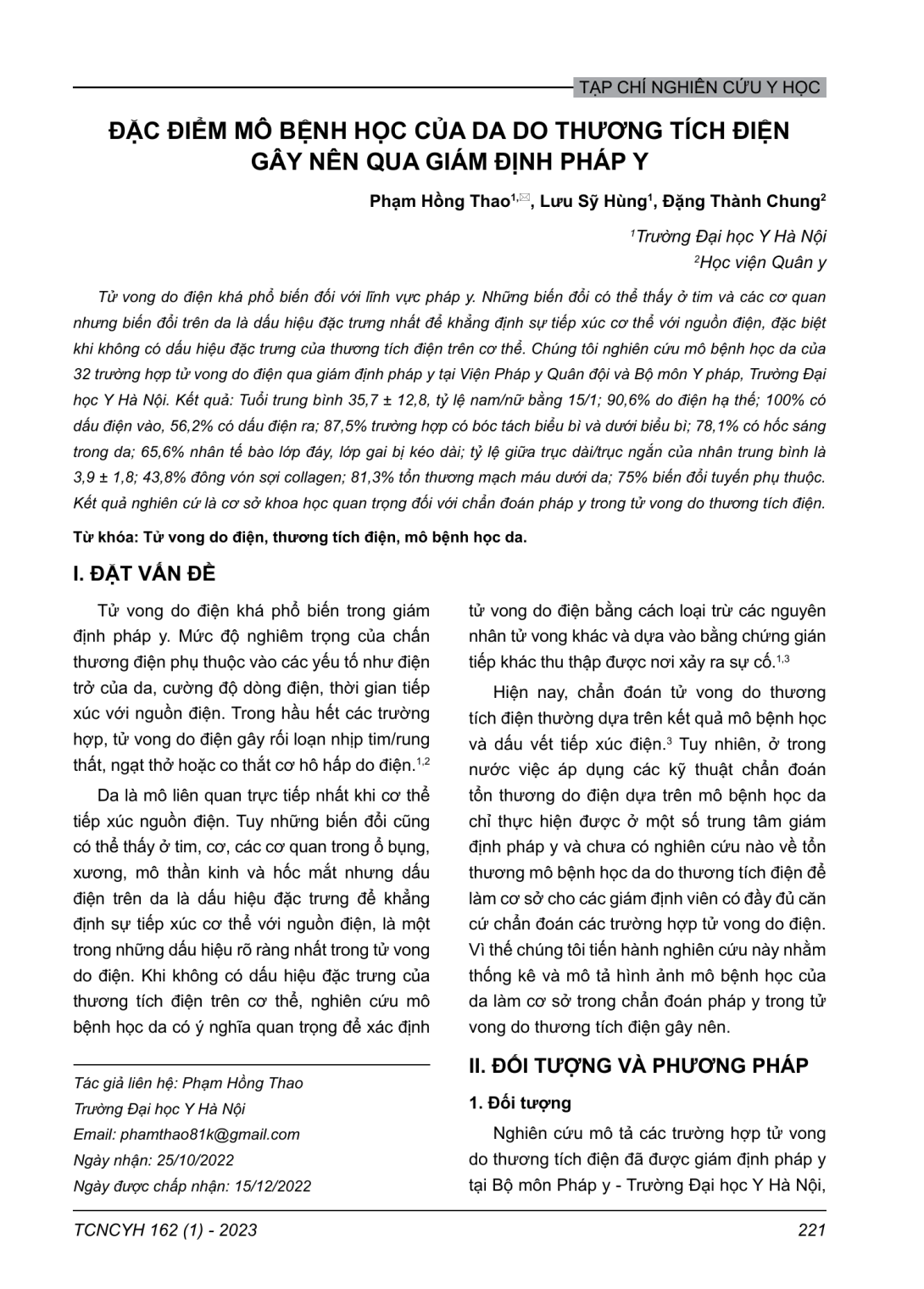 Tử vong do điện khá phổ biến đối với lĩnh vực pháp y. Những biến đổi có thể thấy ở tim và các cơ quan nhưng biến đổi trên da là dấu hiệu đặc trưng nhất để khẳng định sự tiếp xúc cơ thể với nguồn điện, đặc biệt khi không có dấu hiệu đặc trưng của thương tích điện trên cơ thể. Chúng tôi nghiên cứu mô bệnh học da của 32 trường hợp tử vong do điện qua giám định pháp y tại Viện Pháp y Quân đội và Bộ môn Y pháp, Trường Đại học Y Hà Nội. Kết quả: Tuổi trung bình 35,7 ± 12,8, tỷ lệ nam/nữ bằng 15/1; 90,6% do điện hạ thế; 100% có dấu điện vào, 56,2% có dấu điện ra; 87,5% trường hợp có bóc tách biểu bì và dưới biểu bì; 78,1% có hốc sáng trong da; 65,6% nhân tế bào lớp đáy, lớp gai bị kéo dài; tỷ lệ giữa trục dài/trục ngắn của nhân trung bình là 3,9 ± 1,8; 43,8% đông vón sợi collagen; 81,3% tổn thương mạch máu dưới da; 75% biến đổi tuyến phụ thuộc. Kết quả nghiên cứ là cơ sở khoa học quan trọng đối với chẩn đoán pháp y trong tử vong do thương tích điện.