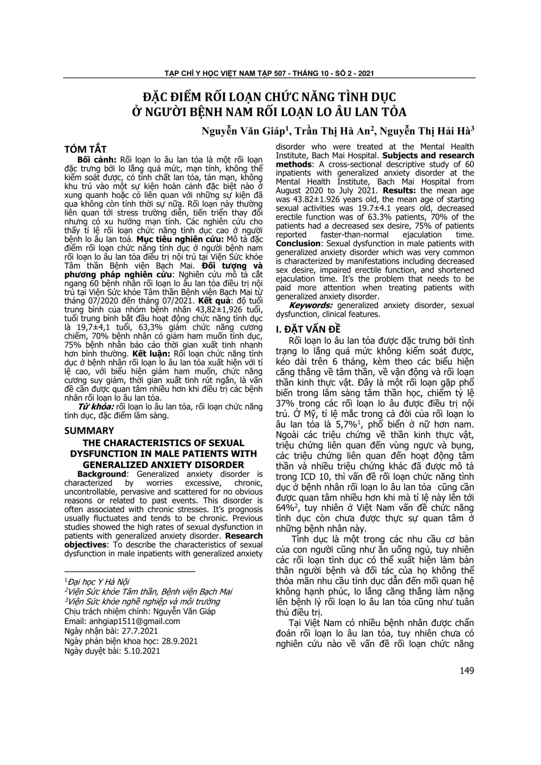 Generalized anxiety disorder is c-haracterized by worries excessive, chronic, uncontrollable, pervasive and scattered for no obvious reasons or related to past events. This disorder is often associated with chronic stresses. It’s prognosis usually fluctuates and tends to be chronic. Previous studies showed the high rates of sexual dysfunction in patients with generalized anxiety disorder. Research objectives: To describe the c-haracteristics of sexual dysfunction in male inpatients with generalized anxiety disorder who were treated at the Mental Health Institute, Bach Mai Hospital. Subjects and research methods: A cross-sectional descriptive study of 60 inpatients with generalized anxiety disorder at the Mental Health Institute, Bach Mai Hospital f-rom August 2020 to July 2021. Results: the mean age was 43.82±1.926 years old, the mean age of starting sexual activities was 19.7±4.1 years old, decreased erectile function was of 63.3% patients, 70% of the patients had a decreased sex desire, 75% of patients reported faster-than-normal ejaculation time. Conclusion: Sexual dysfunction in male patients with generalized anxiety disorder which was very common is c-haracterized by manifestations including decreased sex desire, impaired erectile function, and shortened ejaculation time. It’s the problem that needs to be paid more attention when treating patients with generalized anxiety disorder.