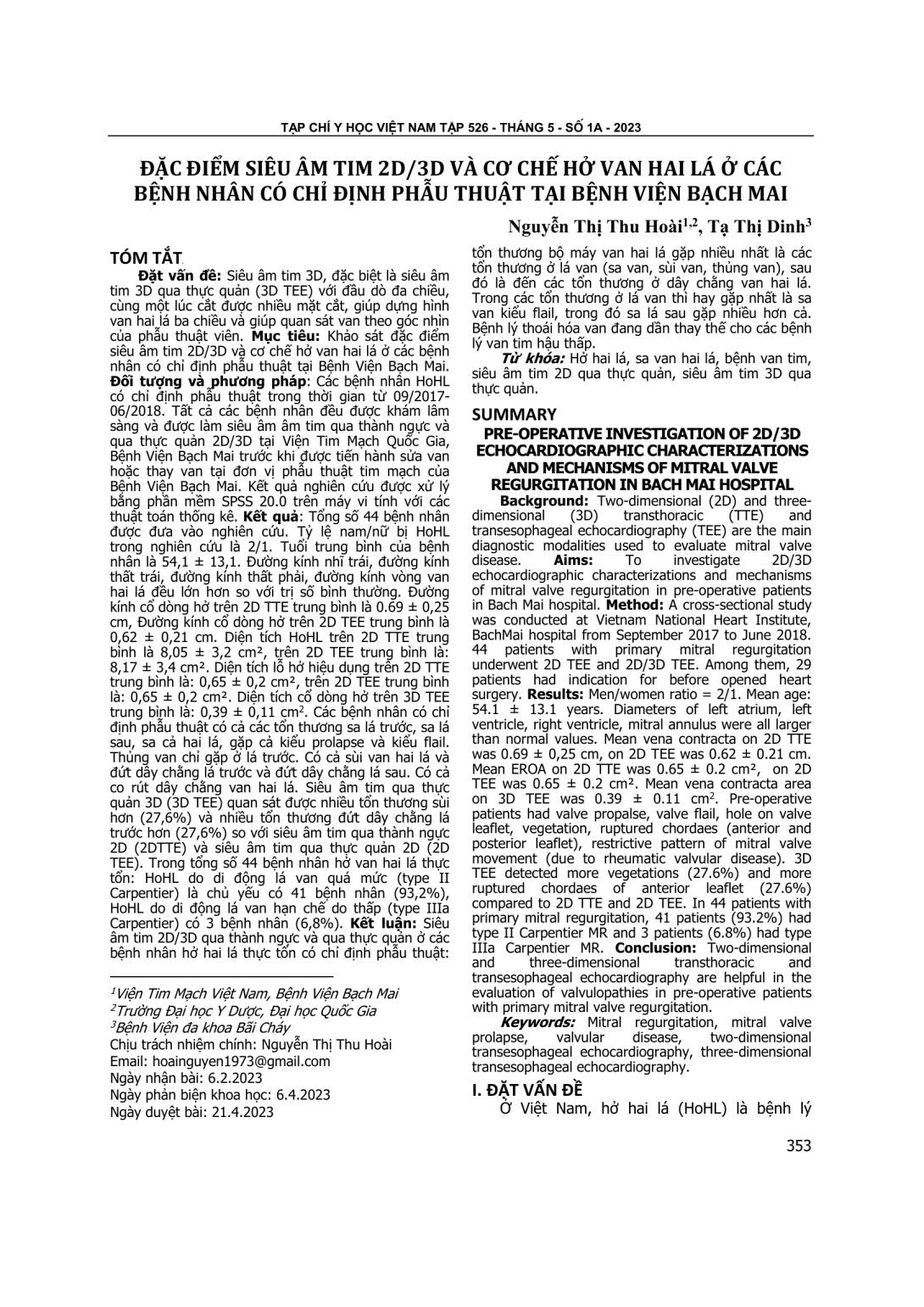 Khảo sát đặc điểm siêu âm tim 2D/3D và cơ chế hở van hai lá ở các bệnh nhân có chỉ định phẫu thuật tại Bệnh Viện Bạch Mai. Đối tượng và phương pháp: Các bệnh nhân HoHL có chỉ định phẫu thuật trong thời gian từ 09/2017-06/2018. Tất cả các bệnh nhân đều được khám lâm sàng và được làm siêu âm âm tim qua thành ngực và qua thực quản 2D/3D tại Viện Tim Mạch Quốc Gia, Bệnh Viện Bạch Mai trước khi được tiến hành sửa van hoặc thay van tại đơn vị phẫu thuật tim mạch của Bệnh Viện Bạch Mai. Kết quả nghiên cứu được xử lý bằng phần mềm SPSS 20.0 trên máy vi tính với các thuật toán thống kê. Kết quả: Tổng số 44 bệnh nhân được đưa vào nghiên cứu. Tỷ lệ nam/nữ bị HoHL trong nghiên cứu là 2/1. Tuổi trung bình của bệnh nhân là 54,1 ± 13,1. Đường kính nhĩ trái, đường kính thất trái, đường kính thất phải, đường kính vòng van hai lá đều lớn hơn so với trị số bình thường. Đường kính cổ dòng hở trên 2D TTE trung bình là 0.69 ± 0,25 cm, Đường kính cổ dòng hở trên 2D TEE trung bình là 0,62 ± 0,21 cm. Diện tích HoHL trên 2D TTE trung bình là 8,05 ± 3,2 cm², trên 2D TEE trung bình là: 8,17 ± 3,4 cm². Diện tích lỗ hở hiệu dụng trên 2D TTE trung bình là: 0,65 ± 0,2 cm², trên 2D TEE trung bình là: 0,65 ± 0,2 cm². Diện tích cổ dòng hở trên 3D TEE trung bình là: 0,39 ± 0,11 cm2. Các bệnh nhân có chỉ định phẫu thuật có cả các tổn thương sa lá trước, sa lá sau, sa cả hai lá, gặp cả kiểu prolapse và kiểu flail. Thủng van chỉ gặp ở lá trước. Có cả sùi van hai lá và đứt dây chằng lá trước và đứt dây chằng lá sau. Có cả co rút dây chằng van hai lá. Siêu âm tim qua thực quản 3D (3D TEE) quan sát được nhiều tổn thương sùi hơn (27,6%) và nhiều tổn thương đứt dây chằng lá trước hơn (27,6%) so với siêu âm tim qua thành ngực 2D (2DTTE) và siêu âm tim qua thực quản 2D (2D TEE). Trong tổng số 44 bệnh nhân hở van hai lá thực tổn: HoHL do di động lá van quá mức (type II Carpentier) là chủ yếu có 41 bệnh nhân (93,2%), HoHL do di động lá van hạn chế do thấp (type IIIa Carpentier) có 3 bệnh nhân (6,8%).