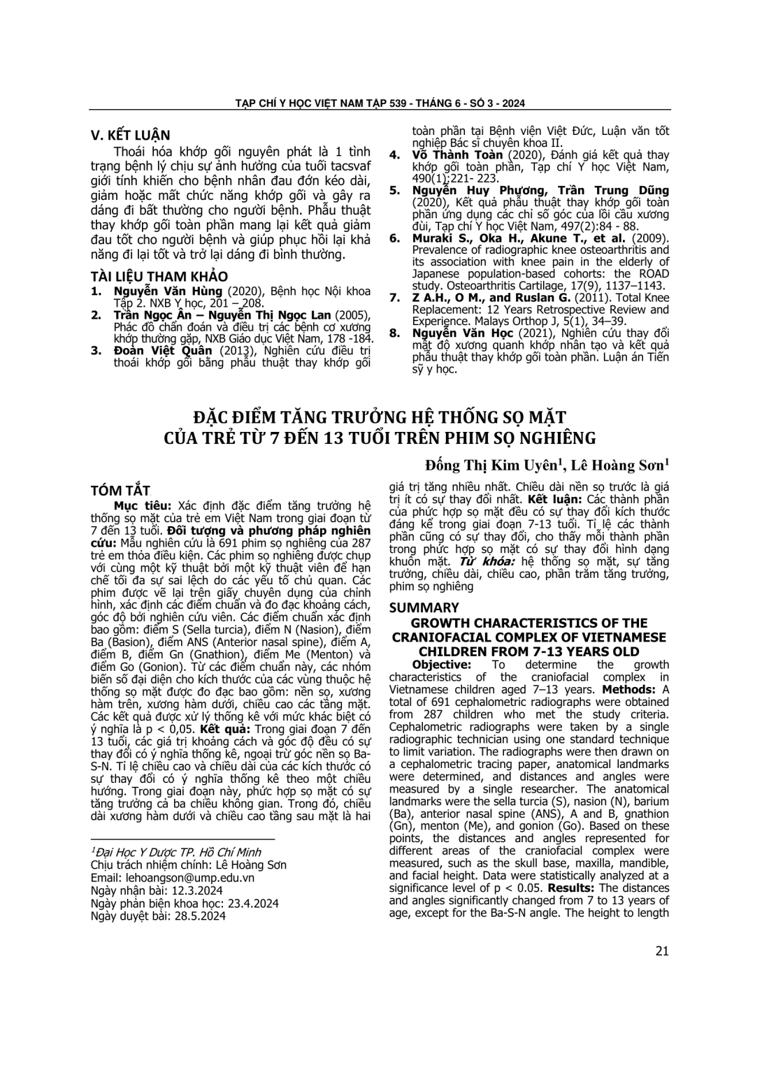 Xác định đặc điểm tăng trưởng hệ thống sọ mặt của trẻ em Việt Nam trong giai đoạn từ 7 đến 13 tuổi. Đối tượng và phương pháp nghiên cứu: Mẫu nghiên cứu là 691 phim sọ nghiêng của 287 trẻ em thỏa điều kiện. Các phim sọ nghiêng được chụp với cùng một kỹ thuật bởi một kỹ thuật viên để hạn chế tối đa sự sai lệch do các yếu tố chủ quan. Các phim được vẽ lại trên giấy chuyên dụng của chỉnh hình, xác định các điểm chuẩn và đo đạc khoảng cách, góc độ bởi nghiên cứu viên. Các điểm chuẩn xác định bao gồm: điểm S (Sella turcia), điểm N (Nasion), điểm Ba (Basion), điểm ANS (Anterior nasal spine), điểm A, điểm B, điểm Gn (Gnathion), điểm Me (Menton) và điểm Go (Gonion). Từ các điểm chuẩn này, các nhóm biến số đại diện cho kích thước của các vùng thuộc hệ thống sọ mặt được đo đạc bao gồm: nền sọ, xương hàm trên, xương hàm dưới, chiều cao các tầng mặt. Các kết quả được xử lý thống kê với mức khác biệt có ý nghĩa là p < 0,05. Kết quả: Trong giai đoạn 7 đến 13 tuổi, các giá trị khoảng cách và góc độ đều có sự thay đổi có ý nghĩa thống kê, ngoại trừ góc nền sọ Ba- S-N. Tỉ lệ chiều cao và chiều dài của các kích thước có sự thay đổi có ý nghĩa thống kê theo một chiều hướng. Trong giai đoạn này, phức hợp sọ mặt có sự tăng trưởng cả ba chiều không gian. Trong đó, chiều dài xương hàm dưới và chiều cao tầng sau mặt là hai giá trị tăng nhiều nhất. Chiều dài nền sọ trước là giá trị ít có sự thay đổi nhất. Kết luận: Các thành phần của phức hợp sọ mặt đều có sự thay đổi kích thước đáng kể trong giai đoạn 7-13 tuổi. Tỉ lệ các thành phần cũng có sự thay đổi, cho thấy mỗi thành phần trong phức hợp sọ mặt có sự thay đổi hình dạng khuôn mặt.