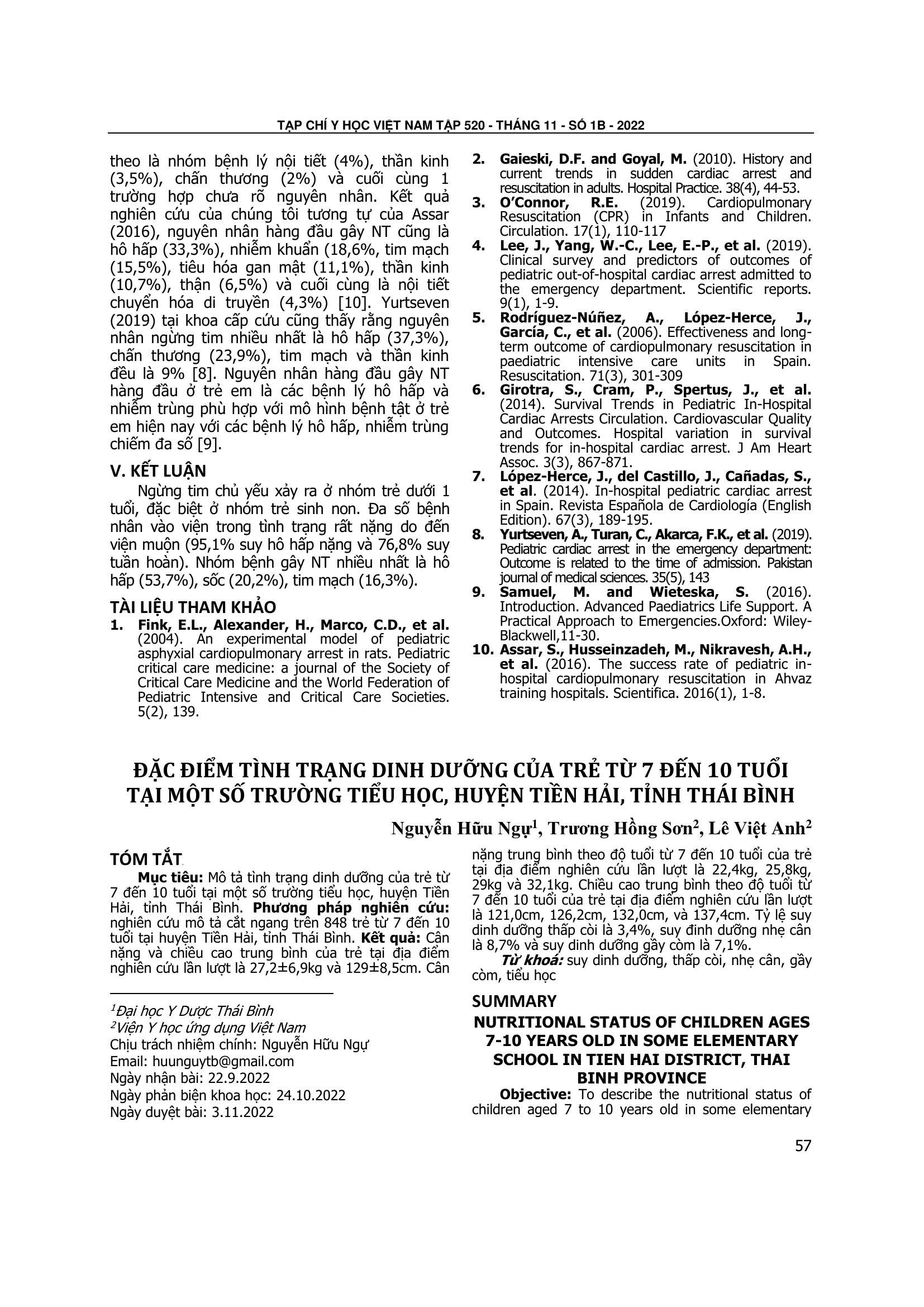 Mô tả tình trạng dinh dưỡng của trẻ từ 7 đến 10 tuổi tại một số trường tiểu học, huyện Tiền Hải, tỉnh Thái Bình. Phương pháp nghiên cứu: nghiên cứu mô tả cắt ngang trên 848 trẻ từ 7 đến 10 tuổi tại huyện Tiền Hải, tỉnh Thái Bình. Kết quả: Cân nặng và chiều cao trung bình của trẻ tại địa điểm nghiên cứu lần lượt là 27,2±6,9kg và 129±8,5cm. Cân nặng trung bình theo độ tuổi từ 7 đến 10 tuổi của trẻ tại địa điểm nghiên cứu lần lượt là 22,4kg, 25,8kg, 29kg và 32,1kg. Chiều cao trung bình theo độ tuổi từ 7 đến 10 tuổi của trẻ tại địa điểm nghiên cứu lần lượt là 121,0cm, 126,2cm, 132,0cm, và 137,4cm. Tỷ lệ suy dinh dưỡng thấp còi là 3,4%, suy đinh dưỡng nhẹ cân là 8,7% và suy dinh dưỡng gầy còm là 7,1%.