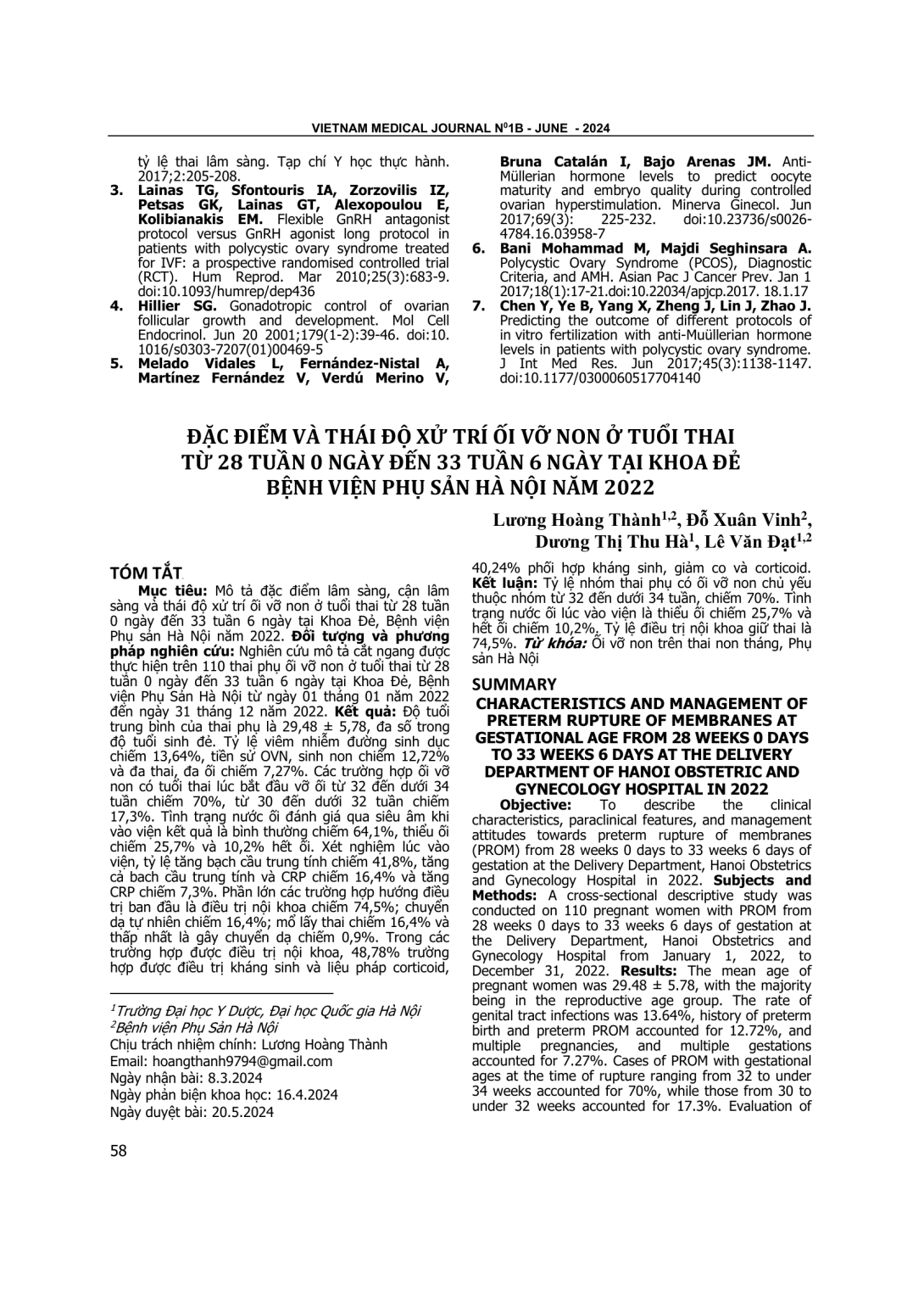 Mô tả đặc điểm lâm sàng, cận lâm sàng và thái độ xử trí ối vỡ non ở tuổi thai từ 28 tuần 0 ngày đến 33 tuần 6 ngày tại Khoa Đẻ, Bệnh viện Phụ sản Hà Nội năm 2022. Đối tượng và phương pháp nghiên cứu: Nghiên cứu mô tả cắt ngang được thực hiện trên 110 thai phụ ối vỡ non ở tuổi thai từ 28 tuần 0 ngày đến 33 tuần 6 ngày tại Khoa Đẻ, Bệnh viện Phụ Sản Hà Nội từ ngày 01 tháng 01 năm 2022 đến ngày 31 tháng 12 năm 2022. Kết quả: Độ tuổi trung bình của thai phụ là 29,48 ± 5,78, đa số trong độ tuổi sinh đẻ. Tỷ lệ viêm nhiễm đường sinh dục chiếm 13,64%, tiền sử OVN, sinh non chiếm 12,72% và đa thai, đa ối chiếm 7,27%. Các trường hợp ối vỡ non có tuổi thai lúc bắt đầu vỡ ối từ 32 đến dưới 34 tuần chiếm 70%, từ 30 đến dưới 32 tuần chiếm 17,3%. Tình trạng nước ối đánh giá qua siêu âm khi vào viện kết quả là bình thường chiếm 64,1%, thiểu ối chiếm 25,7% và 10,2% hết ối. Xét nghiệm lúc vào viện, tỷ lệ tăng bạch cầu trung tính chiếm 41,8%, tăng cả bach cầu trung tính và CRP chiếm 16,4% và tăng CRP chiếm 7,3%. Phần lớn các trường hợp hướng điều trị ban đầu là điều trị nội khoa chiếm 74,5%; chuyển dạ tự nhiên chiếm 16,4%; mổ lấy thai chiếm 16,4% và thấp nhất là gây chuyển dạ chiếm 0,9%. Trong các trường hợp được điều trị nội khoa, 48,78% trường hợp được điều trị kháng sinh và liệu pháp corticoid, 40,24% phối hợp kháng sinh, giảm co và corticoid. Kết luận: Tỷ lệ nhóm thai phụ có ối vỡ non chủ yếu thuộc nhóm từ 32 đến dưới 34 tuần, chiếm 70%. Tình trạng nước ối lúc vào viện là thiểu ối chiếm 25,7% và hết ối chiếm 10,2%. Tỷ lệ điều trị nội khoa giữ thai là 74,5%.