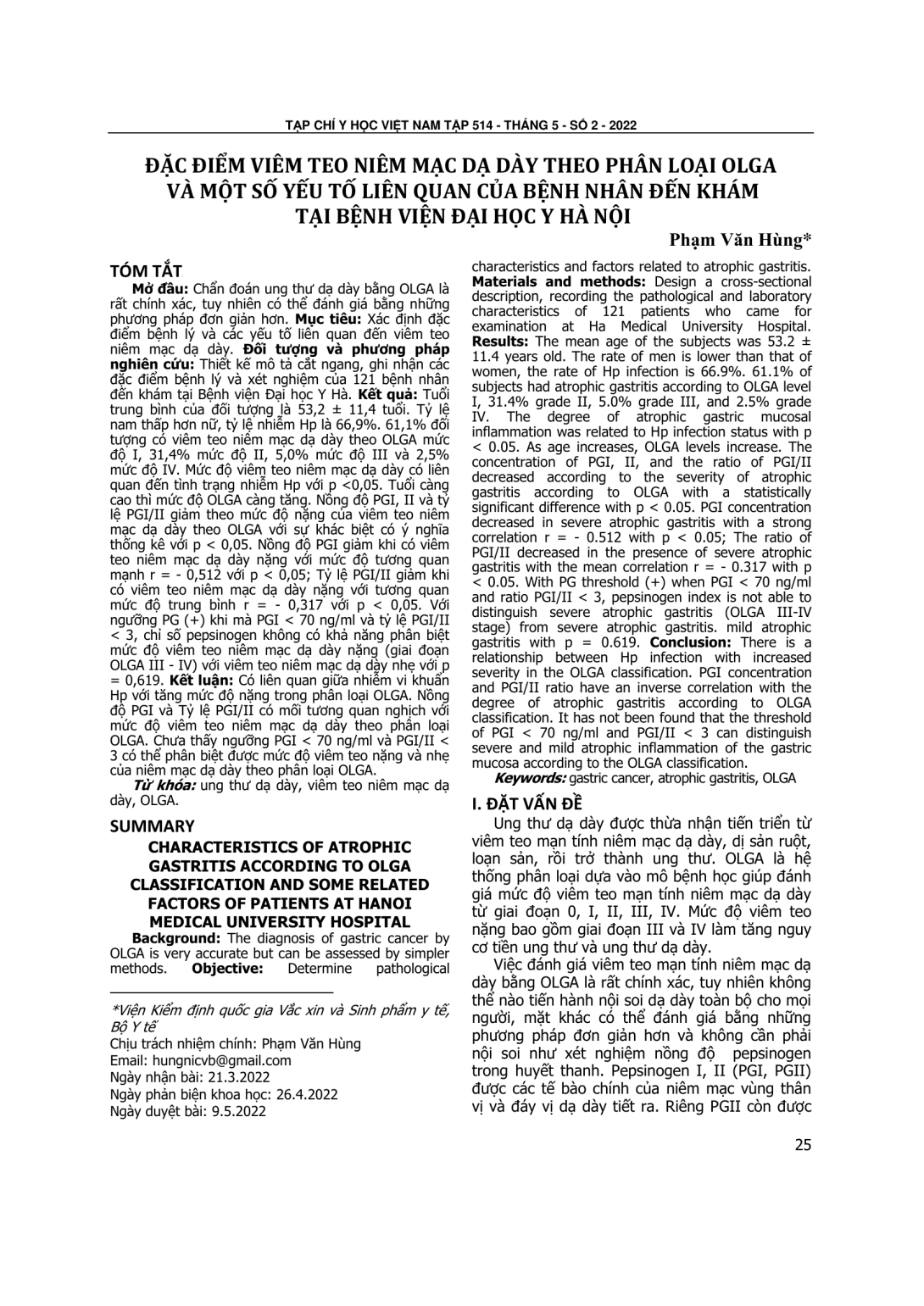 Chẩn đoán ung thư dạ dày bằng OLGA là rất chính xác, tuy nhiên có thể đánh giá bằng những phương pháp đơn giản hơn. Mục tiêu: Xác định đặc điểm bệnh lý và các yếu tố liên quan đến viêm teo niêm mạc dạ dày. Đối tượng và phương pháp nghiên cứu: Thiết kế mô tả cắt ngang, ghi nhận các đặc điểm bệnh lý và xét nghiệm của 121 bệnh nhân đến khám tại Bệnh viện Đại học Y Hà. Kết quả: Tuổi trung bình của đối tượng là 53,2 ± 11,4 tuổi. Tỷ lệ nam thấp hơn nữ, tỷ lệ nhiễm Hp là 66,9%. 61,1% đối tượng có viêm teo niêm mạc dạ dày theo OLGA mức độ I, 31,4% mức độ II, 5,0% mức độ III và 2,5% mức độ IV. Mức độ viêm teo niêm mạc dạ dày có liên quan đến tình trạng nhiễm Hp với p <0,05. Tuổi càng cao thì mức độ OLGA càng tăng. Nồng độ PGI, II và tỷ lệ PGI/II giảm theo mức độ nặng của viêm teo niêm mạc dạ dày theo OLGA với sự khác biệt có ý nghĩa thống kê với p < 0,05. Nồng độ PGI giảm khi có viêm teo niêm mạc dạ dày nặng với mức độ tương quan mạnh r = - 0,512 với p < 0,05; Tỷ lệ PGI/II giảm khi có viêm teo niêm mạc dạ dày nặng với tương quan mức độ trung bình r = - 0,317 với p < 0,05. Với ngưỡng PG (+) khi mà PGI < 70 ng/ml và tỷ lệ PGI/II < 3, chỉ số pepsinogen không có khả năng phân biệt mức độ viêm teo niêm mạc dạ dày nặng (giai đoạn OLGA III - IV) với viêm teo niêm mạc dạ dày nhẹ với p = 0,619. Kết luận: Có liên quan giữa nhiễm vi khuẩn Hp với tăng mức độ nặng trong phân loại OLGA. Nồng độ PGI và Tỷ lệ PGI/II có mối tương quan nghịch với mức độ viêm teo niêm mạc dạ dày theo phân loại OLGA. Chưa thấy ngưỡng PGI < 70 ng/ml và PGI/II < 3 có thể phân biệt được mức độ viêm teo nặng và nhẹ của niêm mạc dạ dày theo phân loại OLGA.