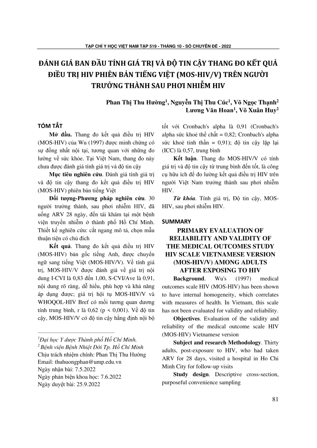 Đánh giá tính giá trị và độ tin cậy thang đo kết quả điều trị HIV (MOS-HIV) phiên bản tiếng Việt Đối tượng-Phương pháp nghiên cứu. 30 người trưởng thành, sau phơi nhiễm HIV, đã uống ARV 28 ngày, đến tái khám tại một bệnh viện truyền nhiễm ở thành phố Hồ Chí Minh. Thiết kế nghiên cứu: cắt ngang mô tả, chọn mẫu thuận tiện có chủ đích Kết quả. Thang đo kết quả điều trị HIV (MOS-HIV) bản gốc tiếng Anh, được chuyển ngữ sang tiếng Việt (MOS-HIV/V). Về tính giá trị, MOS-HIV/V được đánh giá về giá trị nội dung I-CVI là 0,83 đến 1,00, S-CVI/Ave là 0,91, nội dung rõ ràng, dễ hiểu, phù hợp và khả năng áp dụng được; giá trị hội tụ MOS-HIV/V và WHOQOL-HIV Bref có mối tương quan dương tính trung bình, r là 0,62 (p < 0,001). Về độ tin cậy, MOS-HIV/V có độ tin cậy hằng định nội bộ tốt với Cronbach's alpha là 0,91 (Cronbach's alpha sức khoẻ thể chất = 0,82; Cronbach's alpha sức khoẻ tinh thần = 0,91); độ tin cậy lặp lại (ICC) là 0,57, trung bình Kết luận. Thang đo MOS-HIV/V có tính giá trị và độ tin cậy từ trung bình đến tốt, là công cụ hữu ích để đo lường kết quả điều trị HIV trên người Việt Nam trưởng thành sau phơi nhiễm HIV.