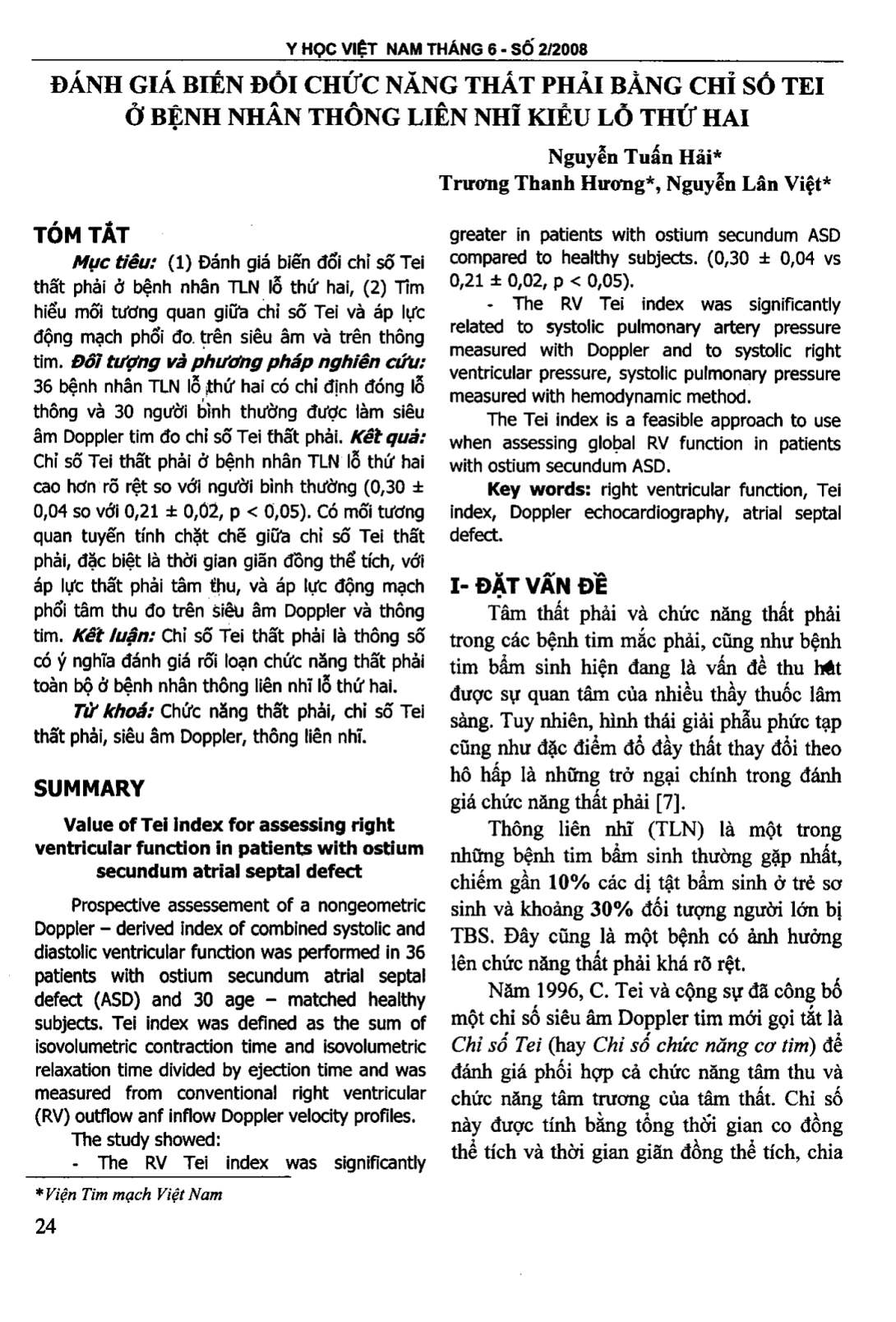 Đánh giá biến đổi chức năng thất phải bằng chỉ số TEI ở bệnh nhân thông liên nhĩ kiểu lõ thứ hai