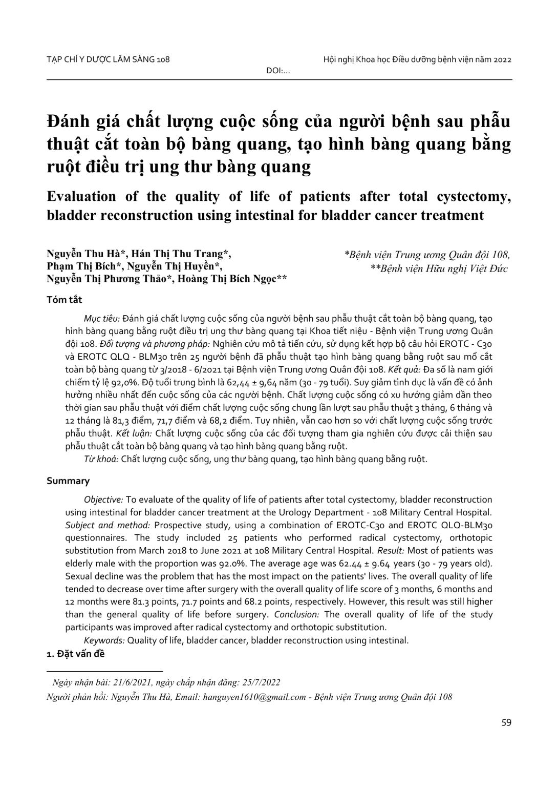 Đánh giá chất lượng cuộc sống của người bệnh sau phẫu thuật cắt toàn bộ bàng quang, tạo hình bàng quang bằng ruột điều trị ung thư bàng quang tại Khoa tiết niệu - Bệnh viện Trung ương Quân đội 108. Đối tượng và phương pháp: Nghiên cứu mô tả tiến cứu, sử dụng kết hợp bộ câu hỏi EROTC - C30 và EROTC QLQ - BLM30 trên 25 người bệnh đã phẫu thuật tạo hình bàng quang bằng ruột sau mổ cắt toàn bộ bàng quang từ 3/2018 - 6/2021 tại Bệnh viện Trung ương Quân đội 108. Kết quả: Đa số là nam giới chiếm tỷ lệ 92,0%. Độ tuổi trung bình là 62,44 ± 9,64 năm (30 - 79 tuổi). Suy giảm tình dục là vấn đề có ảnh hưởng nhiều nhất đến cuộc sống của các người bệnh. Chất lượng cuộc sống có xu hướng giảm dần theo thời gian sau phẫu thuật với điểm chất lượng cuộc sống chung lần lượt sau phẫu thuật 3 tháng, 6 tháng và 12 tháng là 81,3 điểm, 71,7 điểm và 68,2 điểm. Tuy nhiên, vẫn cao hơn so với chất lượng cuộc sống trước phẫu thuật. Kết luận: Chất lượng cuộc sống của các đối tượng tham gia nghiên cứu được cải thiện sau phẫu thuật cắt toàn bộ bàng quang và tạo hình bàng quang bằng ruột.