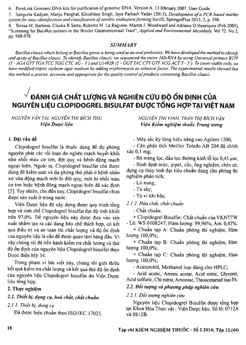 Đánh giá chất lượng và nghiên cứu độ ổn định của nguyên liệu Clopidogrel Bisulfat được tổng hợp tại Việt Nam
