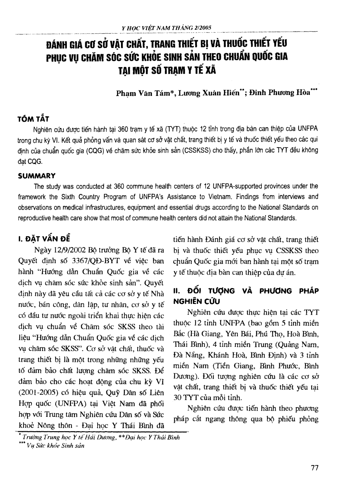 Đánh giá cơ sở vật chất, trang thiết bị và thuốc thiết yếu phục vụ chăm sóc sức khoẻ sinh sản theo chuẩn quốc gia tại một số trạm y tế xã