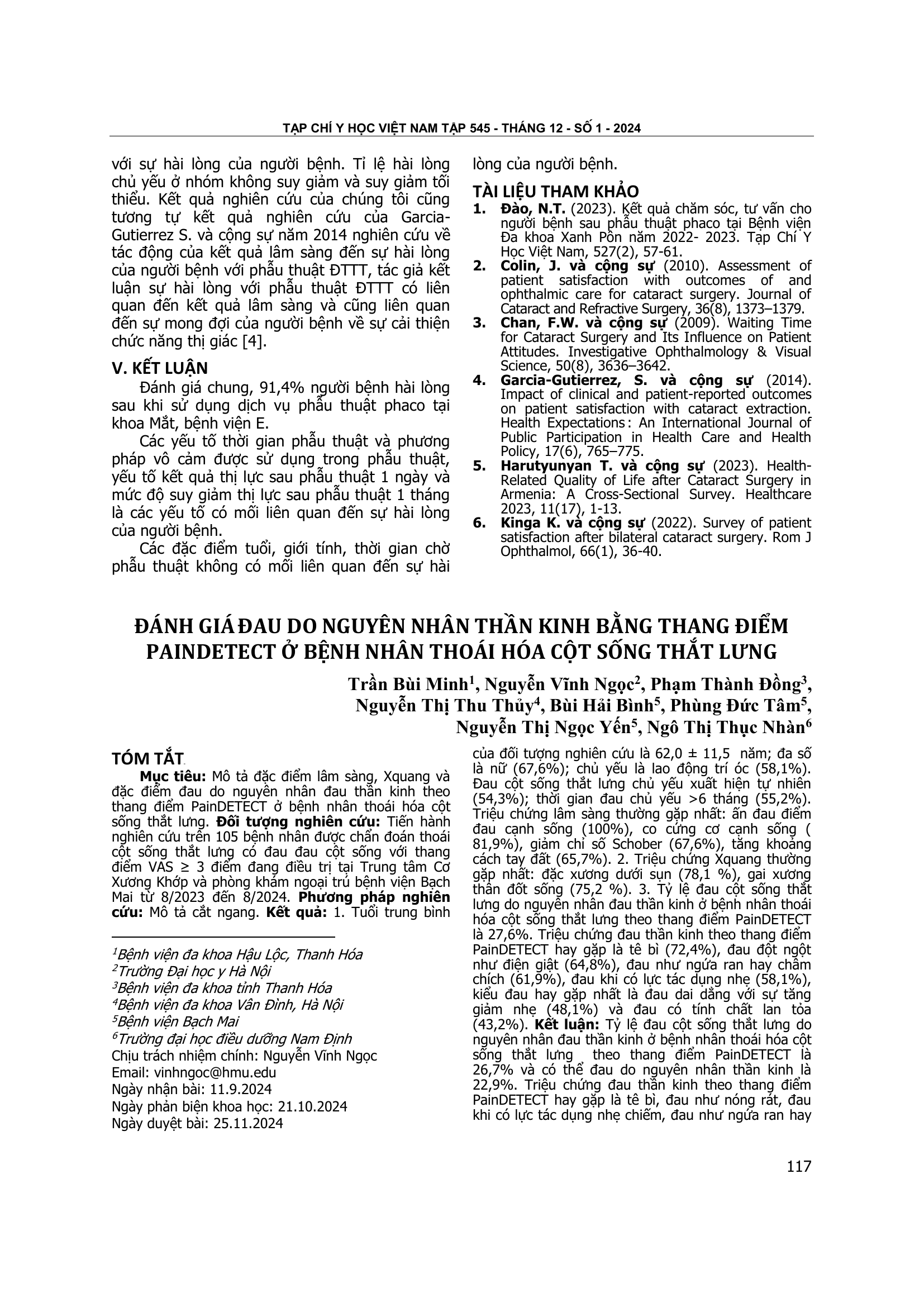 Mô tả đặc điểm lâm sàng, Xquang và đặc điểm đau do nguyên nhân đau thần kinh theo thang điểm PainDETECT ở bệnh nhân thoái hóa cột sống thắt lưng. Đối tượng nghiên cứu: Tiến hành nghiên cứu trên 105 bệnh nhân được chẩn đoán thoái cột sống thắt lưng có đau đau cột sống với thang điểm VAS ≥ 3 điểm đang điều trị tại Trung tâm Cơ Xương Khớp và phòng khám ngoại trú bệnh viện Bạch Mai từ 8/2023 đến 8/2024. Phương pháp nghiên cứu: Mô tả cắt ngang. Kết quả: 1. Tuổi trung bình của đối tượng nghiên cứu là 62,0 ± 11,5 năm; đa số là nữ (67,6%); chủ yếu là lao động trí óc (58,1%). Đau cột sống thắt lưng chủ yếu xuất hiện tự nhiên (54,3%); thời gian đau chủ yếu >6 tháng (55,2%). Triệu chứng lâm sàng thường gặp nhất: ấn đau điểm đau cạnh sống (100%), co cứng cơ cạnh sống ( 81,9%), giảm chỉ số Schober (67,6%), tăng khoảng cách tay đất (65,7%). 2. Triệu chứng Xquang thường gặp nhất: đặc xương dưới sụn (78,1 %), gai xương thân đốt sống (75,2 %). 3. Tỷ lệ đau cột sống thắt lưng do nguyên nhân đau thần kinh ở bệnh nhân thoái hóa cột sống thắt lưng theo thang điểm PainDETECT là 27,6%. Triệu chứng đau thần kinh theo thang điểm PainDETECT hay gặp là tê bì (72,4%), đau đột ngột như điện giật (64,8%), đau như ngứa ran hay châm chích (61,9%), đau khi có lực tác dụng nhẹ (58,1%), kiểu đau hay gặp nhất là đau dai dẳng với sự tăng giảm nhẹ (48,1%) và đau có tính chất lan tỏa (43,2%). Kết luận: Tỷ lệ đau cột sống thắt lưng do nguyên nhân đau thần kinh ở bệnh nhân thoái hóa cột sống thắt lưng theo thang điểm PainDETECT là 26,7% và có thể đau do nguyên nhân thần kinh là 22,9%. Triệu chứng đau thần kinh theo thang điểm PainDETECT hay gặp là tê bì, đau như nóng rát, đau khi có lực tác dụng nhẹ chiếm, đau như ngứa ran hay kim châm, kiểu đau hay gặp nhất là đau dai dẳng với sự tăng giảm nhẹ.
