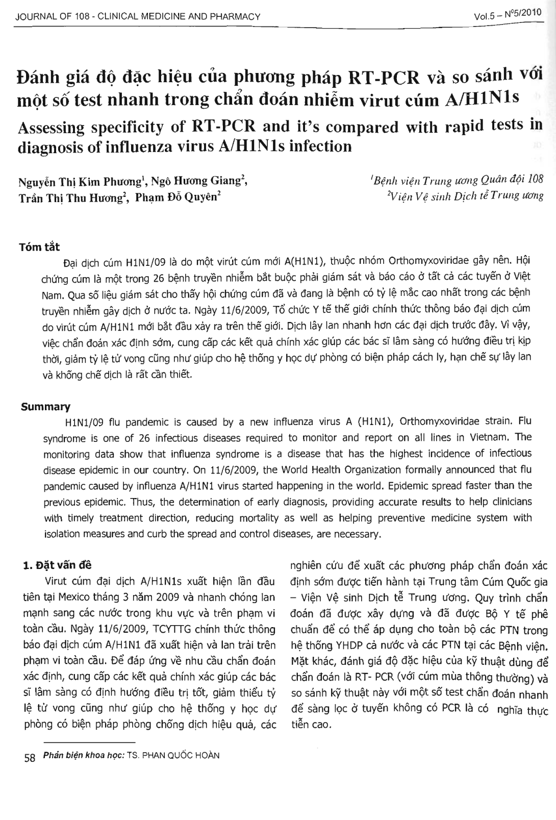 Đánh giá độ đặc hiệu của phương pháp RT-PCR và so sánh với một số test nhanh trong chẩn đoán nhiễm virut cúm A/H1N1s