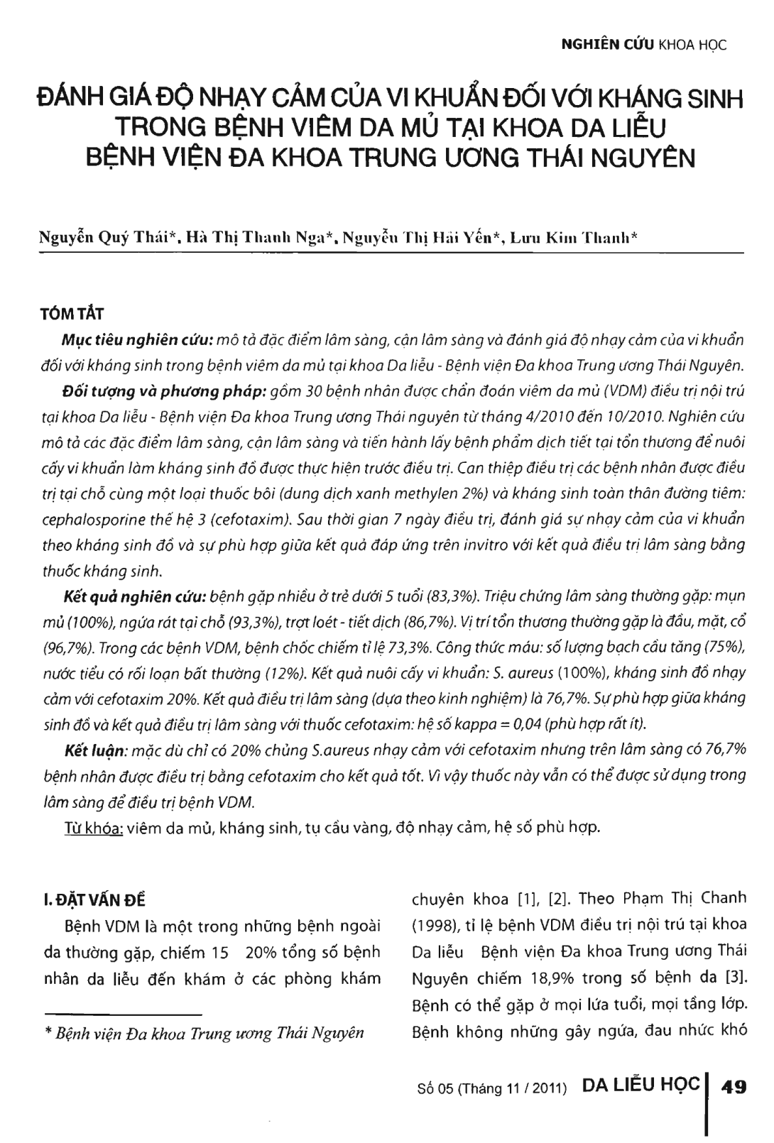 Objectives: To describe clinical and biological characteristics and to evaluate sensitivity of bacteria to antibiotics in pyodermatitis at Dermatology Department in Thai Nguyen Central General Hospital. Methods: 30 patients were diagnosed with pyodermatitis treated at Dermatology Department in Thai Nguyen Central General Hospital from April, 2010 to October 2010. The study describes clinical and biological characteristics and secretion fluid in wounded area taken for antimicrobial assay (according to a routine technique) to be done before treatment with topical applying of blue methylene 2 percent and systematic antibiotics of Cephalosporin. After 7 days of treatment, evaluating sensitivity of bacteria to antibiotics and appropriateness between results in vitro and clinical results treated with antibiotics. Results: Pyodermatitis was commonly seen in children under 5 years (83.3 percent); clinical symptoms are: pustulation (100 percent), local itching (93.3 percent) and ulceration (86.7 percent). The common sites were on the head, the face and the neck (96.7 percent). Impetigo accounts for 73.3 percent of pyoderma titis. Increased white blood cells accounted for 80 percent of cases; abnormal urine was 12 percent of patients. Bacterial culture: 100 percent of cases were S. aureus ; 20 percent of them sensitivity to cefotaxime. However, 76.7 percent of patients treated with cefotaxime had good results and coefficient of Kappa = 0.04 (a little appropriateness). Conclusion: One third of bacteria resist to Cefotaxime in vitro. However, clinically, it was still used in treatment of pyodermatitis with good result.