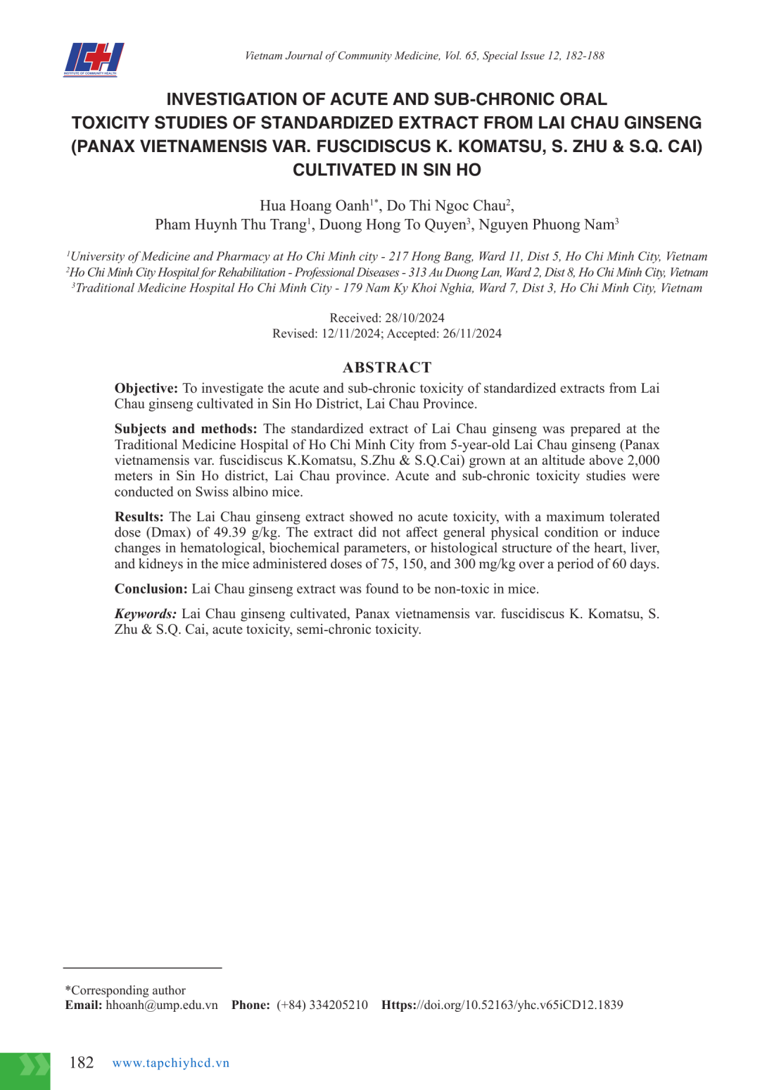 To investigate the acute and sub-chronic toxicity of standardized extracts from Lai Chau ginseng cultivated in Sin Ho District, Lai Chau Province. Subjects and methods: The standardized extract of Lai Chau ginseng was prepared at the Traditional Medicine Hospital of Ho Chi Minh City from 5-year-old Lai Chau ginseng (Panax vietnamensis var. fuscidiscus K.Komatsu, S.Zhu & S.Q.Cai) grown at an altitude above 2,000 meters in Sin Ho district, Lai Chau province. Acute and sub-chronic toxicity studies were conducted on Swiss albino mice. Results: The Lai Chau ginseng extract showed no acute toxicity, with a maximum tolerated dose (Dmax) of 49.39 g/kg. The extract did not affect general physical condition or induce changes in hematological, biochemical parameters, or histological structure of the heart, liver, and kidneys in the mice administered doses of 75, 150, and 300 mg/kg over a period of 60 days. Conclusion: Lai Chau ginseng extract was found to be non-toxic in mice.