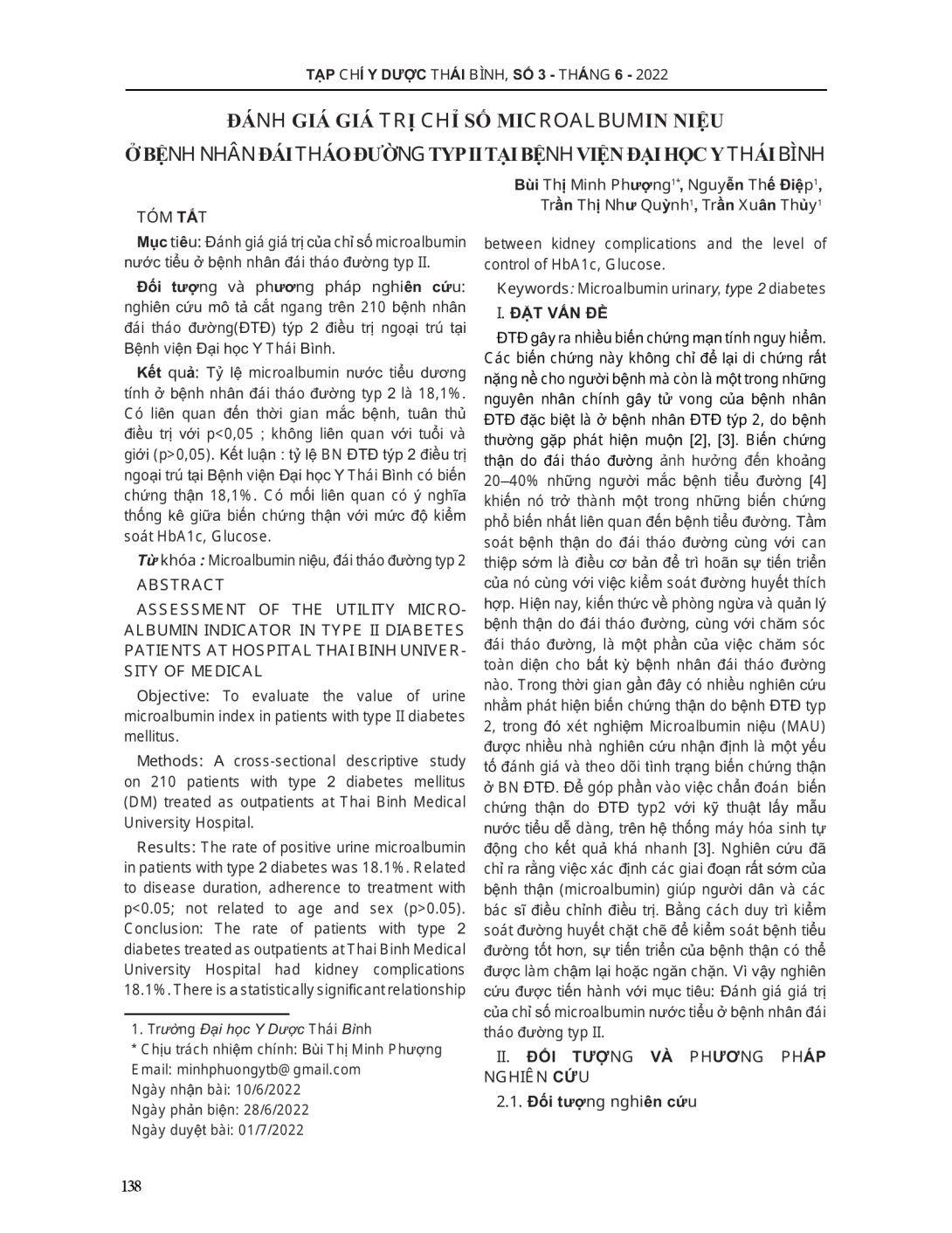 Đánh giá giá trị của chỉ số microalbumin nước tiểu ở bệnh nhân đái tháo đường typ II. Đối tượng và phương pháp nghiên cứu: nghiên cứu mô tả cắt ngang trên 210 bệnh nhân đái tháo đường(ĐTĐ) týp 2 điều trị ngoại trú tại Bệnh viện Đại học Y Thái Bình. Kết quả: Tỷ lệ microalbumin nước tiểu dương tính ở bệnh nhân đái tháo đường typ 2 là 18,1%. Có liên quan đến thời gian mắc bệnh, tuân thủ điều trị với p<0,05 ; không liên quan với tuổi và giới (p>0,05). Kết luận : tỷ lệ BN ĐTĐ týp 2 điều trị ngoại trú tại Bệnh viện Đại học Y Thái Bình có biến chứng thận 18,1%. Có mối liên quan có ý nghĩa thống kê giữa biến chứng thận với mức độ kiểm soát HbA1c, Glucose.