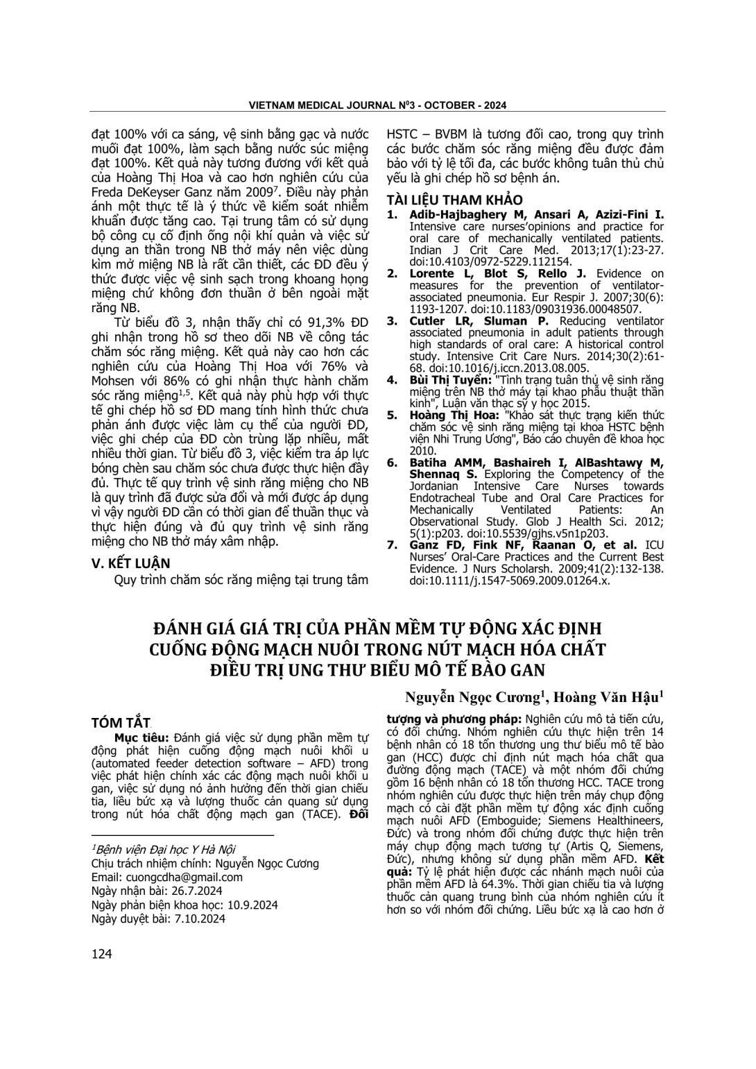 Đánh giá việc sử dụng phần mềm tự động phát hiện cuống động mạch nuôi khối u (automated feeder detection software – AFD) trong việc phát hiện chính xác các động mạch nuôi khối u gan, việc sử dụng nó ảnh hưởng đến thời gian chiếu tia, liều bức xạ và lượng thuốc cản quang sử dụng trong nút hóa chất động mạch gan (TACE). Đối tượng và phương pháp: Nghiên cứu mô tả tiến cứu, có đối chứng. Nhóm nghiên cứu thực hiện trên 14 bệnh nhân có 18 tổn thương ung thư biểu mô tế bào gan (HCC) được chỉ định nút mạch hóa chất qua đường động mạch (TACE) và một nhóm đối chứng gồm 16 bệnh nhân có 18 tổn thương HCC. TACE trong nhóm nghiên cứu được thực hiện trên máy chụp động mạch có cài đặt phần mềm tự động xác định cuống mạch nuôi AFD (Emboguide; Siemens Healthineers, Đức) và trong nhóm đối chứng được thực hiện trên máy chụp động mạch tương tự (Artis Q, Siemens, Đức), nhưng không sử dụng phần mềm AFD. Kết quả: Tỷ lệ phát hiện được các nhánh mạch nuôi của phần mềm AFD là 64.3%. Thời gian chiếu tia và lượng thuốc cản quang trung bình của nhóm nghiên cứu ít hơn so với nhóm đối chứng. Liều bức xạ là cao hơn ở nhóm có sử dụng AFD so với nhóm chứng. Kết luận: Phần mềm AFD cung cấp thêm thông tin về những cuống mạch nuôi khối u nhờ đó nút mạch đúng mục tiêu, hiệu quả cao hơn, đặc biệt là các khối u nhỏ khó phát hiện cuống mạch nuôi trên DSA thông thường. Thời gian chiếu tia và lượng thuốc cản quang ít hơn nhưng liều chiếu cao hơn do bệnh nhân phải chụp CBCT để chạy phần mềm AFD.