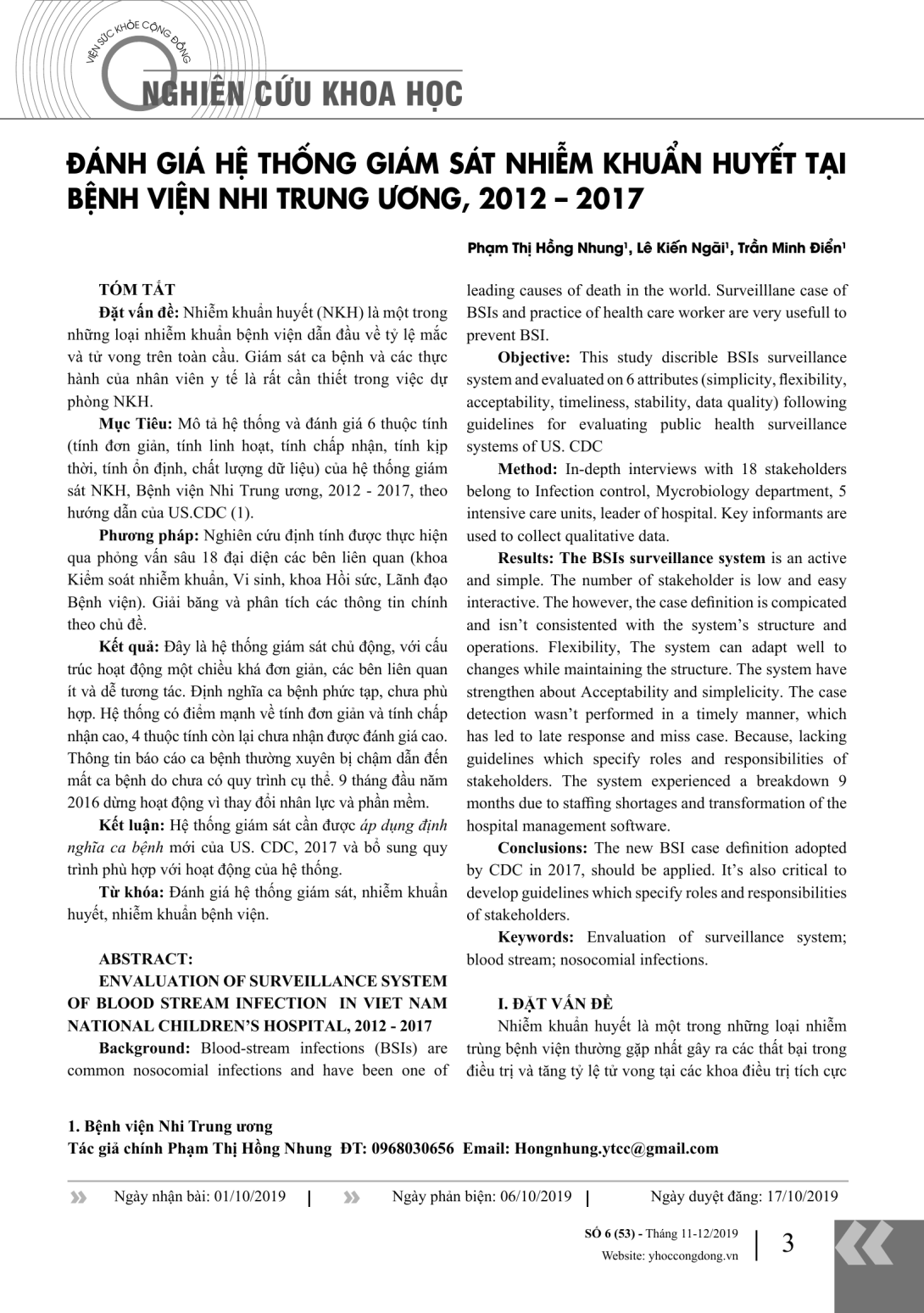 Mô tả hệ thống và đánh giá 6 thuộc tính (tính đơn giản, tính linh hoạt, tính chấp nhận, tính kịp thời, tính ổn định, chất lượng dữ liệu) của hệ thống giám sát nhiễm khuẩn huyết, bệnh viện Nhi Trung ương, 2012 - 2017, theo hướng dẫn của US.CDC. Nghiên cứu định tính được thực hiện qua phỏng vấn sâu 18 đại diện các bên liên quan (khoa Kiểm soát nhiễm khuẩn, Vi sinh, khoa Hồi sức, Lãnh đạo Bệnh viện). Giải băng và phân tích các thông tin chính theo chủ đề. Kết quả Đây là hệ thống giám sát chủ động, với cấu trúc hoạt động một chiều khá đơn giản, các bên liên quan ít và dễ tương tác. Định nghĩa ca bệnh phức tạp, chưa phù hợp. Hệ thống có điểm mạnh về tính đơn giản và tính chấp nhận cao, 4 thuộc tính còn lại chưa nhận được đánh giá cao. Thông tin báo cáo ca bệnh thường xuyên bị chậm dẫn đến mất ca bệnh do chưa có quy trình cụ thể. 9 tháng đầu năm 2016 dừng hoạt động vì thay đổi nhân lực và phần mềm.