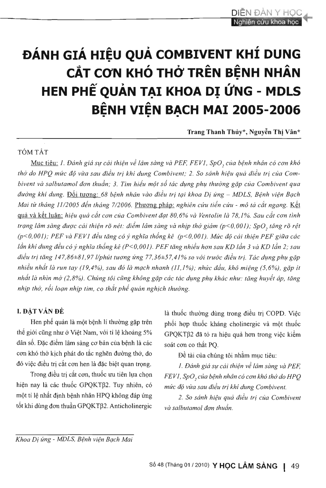 Đánh giá hiệu quả combivent khí dung cắt cơn khó thở trên bệnh nhân hen phế quản tại khoa dị ứng - MDLS Bệnh viện Bạch Mai 2005-2006