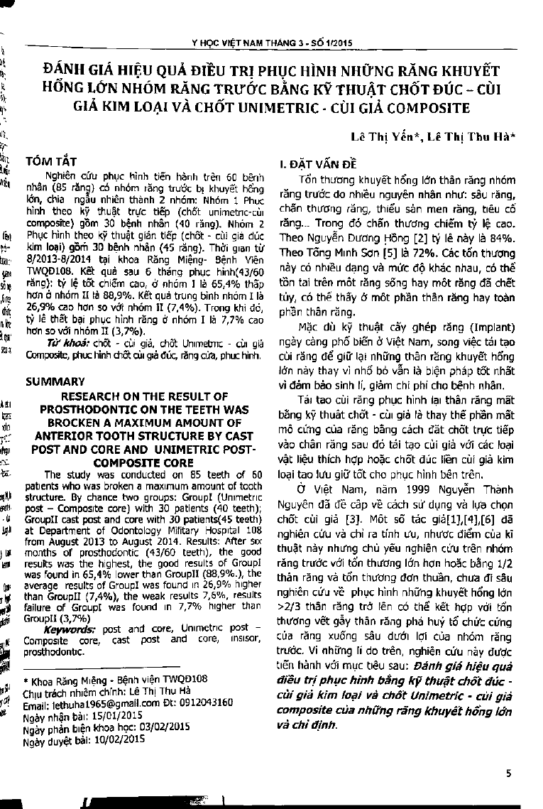 Đánh giá hiệu quả điều trị phục hình những răng khuyết hổng lớn nhóm răng trước bằng kỹ thuật chốt đúc - cùi giả kim loại và chốt Unimetric - cùi giả Composite