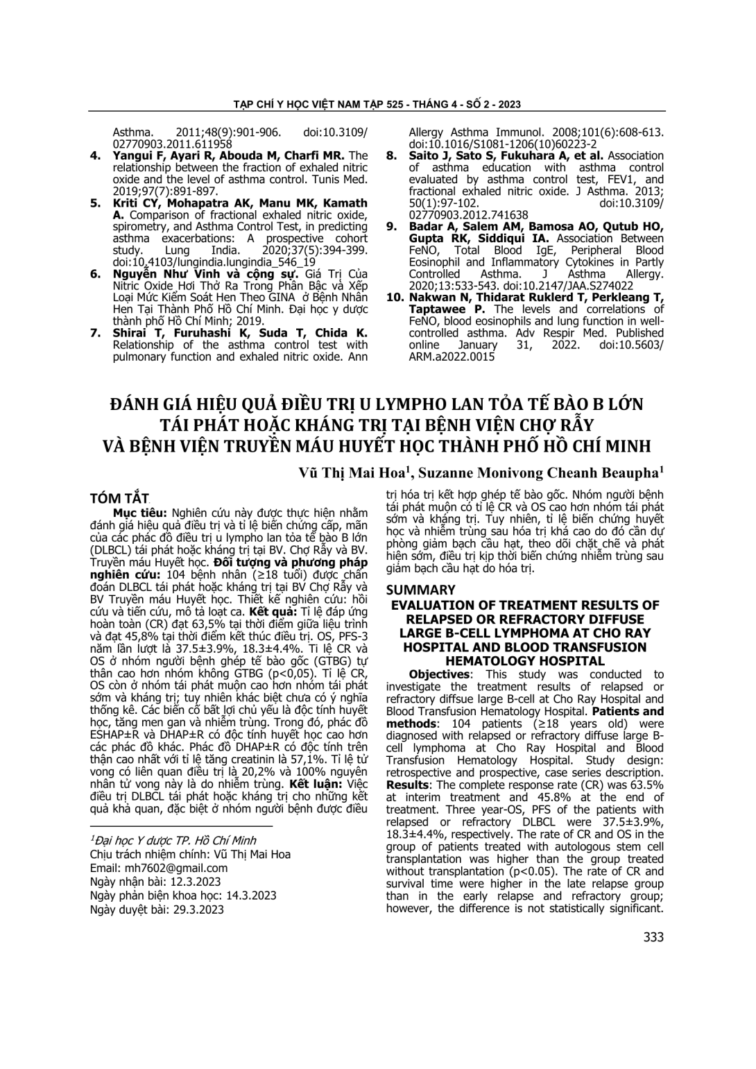 Đánh giá hiệu quả điều trị và tỉ lệ biến chứng cấp, mãn của các phác đồ điều trị u lympho lan tỏa tế bào B lớn (DLBCL) tái phát hoặc kháng trị tại BV. Chợ Rẫy và BV. Truyền máu Huyết học. Đối tượng và phương pháp nghiên cứu: 104 bệnh nhân (≥18 tuổi) được chẩn đoán DLBCL tái phát hoặc kháng trị tại BV Chợ Rẫy và BV Truyền máu Huyết học. Thiết kế nghiên cứu: hồi cứu và tiến cứu, mô tả loạt ca. Kết quả: Tỉ lệ đáp ứng hoàn toàn (CR) đạt 63,5% tại thời điểm giữa liệu trình và đạt 45,8% tại thời điểm kết thúc điều trị. OS, PFS-3 năm lần lượt là 37.5±3.9%, 18.3±4.4%. Ti lệ CR và OS ở nhóm người bệnh ghép tế bào gốc (GTBG) tự thân cao hơn nhóm không GTBG (p<0,05). Tỉ lệ CR, OS còn ở nhóm tái phát muộn cao hơn nhóm tái phát sớm và kháng trị; tuy nhiên khác biệt chưa có ý nghĩa thống kê. Các biến cố bất lợi chủ yếu là độc tính huyết học, tăng men gan và nhiễm trùng. Trong đó, phác đồ ESHAP±R và DHAP±R có độc tính huyết học cao hơn các phác đồ khác. Phác đồ DHAP±R có độc tính trên thận cao nhất với tỉ lệ tăng creatinin là 57,1%. Tỉ lệ tử vong có liên quan điều trị là 20,2% và 100% nguyên nhân tử vong này là do nhiễm trùng. Kết luận: Việc điều trị DLBCL tái phát hoặc kháng trị cho những kết quả khả quan, đặc biệt ở nhóm người bệnh được điều trị hóa trị kết hợp ghép tế bào gốc. Nhóm người bệnh tái phát muộn có tỉ lệ CR và OS cao hơn nhóm tái phát sớm và kháng trị. Tuy nhiên, tỉ lệ biến chứng huyết học và nhiễm trùng sau hóa trị khá cao do đó cần dự phòng giảm bạch cầu hạt, theo dõi chặt chẽ và phát hiện sớm, điều trị kịp thời biến chứng nhiễm trùng sau giảm bạch cầu hạt do hóa trị.