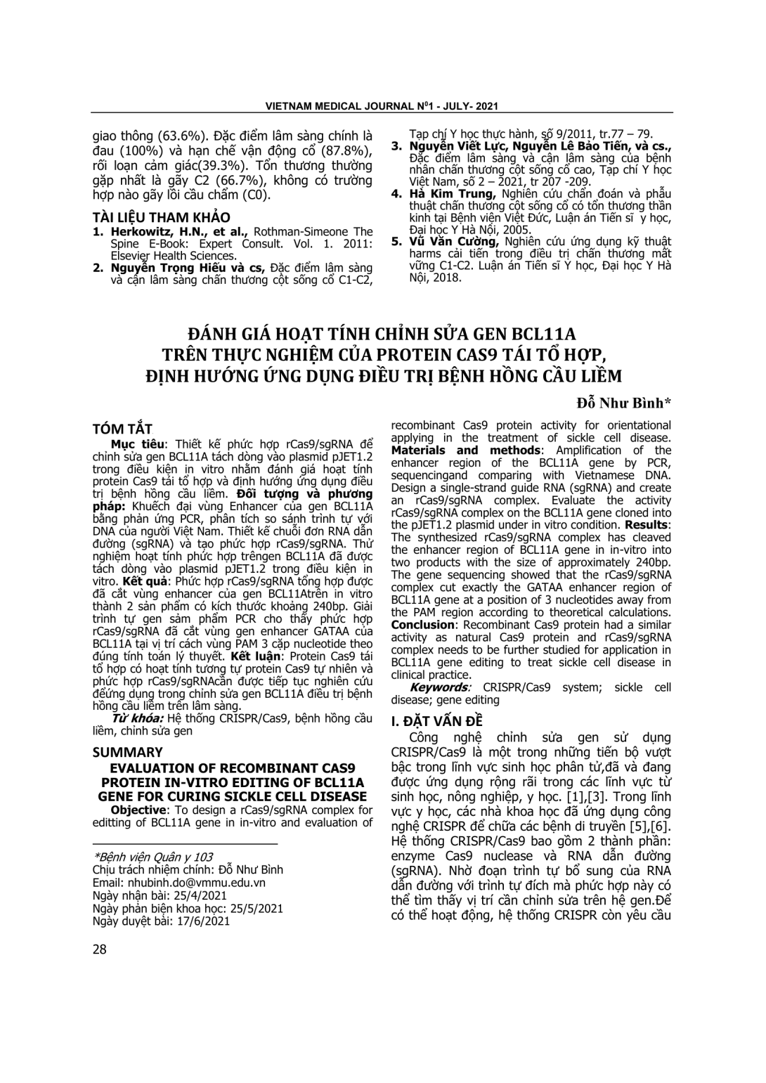 Thiết kế phức hợp rCas9/sgRNA để chỉnh sửa gen BCL11A tách dòng vào plasmid pJET1.2 trong điều kiện in vitro nhằm đánh giá hoạt tính protein Cas9 tái tổ hợp và định hướng ứng dụng điều trị bệnh hồng cầu liềm. Đối tượng và phương pháp: Khuếch đại vùng Enhancer của gen BCL11A bằng phản ứng PCR, phân tích so sánh trình tự với DNA của người Việt Nam. Thiết kế chuỗi đơn RNA dẫn đường (sgRNA) và tạo phức hợp rCas9/sgRNA. Thử nghiệm hoạt tính phức hợp trêngen BCL11A đã được tách dòng vào plasmid pJET1.2 trong điều kiện in vitro. Kết quả: Phức hợp rCas9/sgRNA tổng hợp được đã cắt vùng enhancer của gen BCL11Atrên in vitro thành 2 sản phẩm có kích thước khoảng 240bp. Giải trình tự gen sảm phẩm PCR cho thấy phức hợp rCas9/sgRNA đã cắt vùng gen enhancer GATAA của BCL11A tại vị trí cách vùng PAM 3 cặp nucleotide theo đúng tính toán lý thuyết. Kết luận: Protein Cas9 tái tổ hợp có hoạt tính tương tự protein Cas9 tự nhiên và phức hợp rCas9/sgRNAcần được tiếp tục nghiên cứu đểứng dụng trong chỉnh sửa gen BCL11A điều trị bệnh hồng cầu liềm trên lâm sàng.