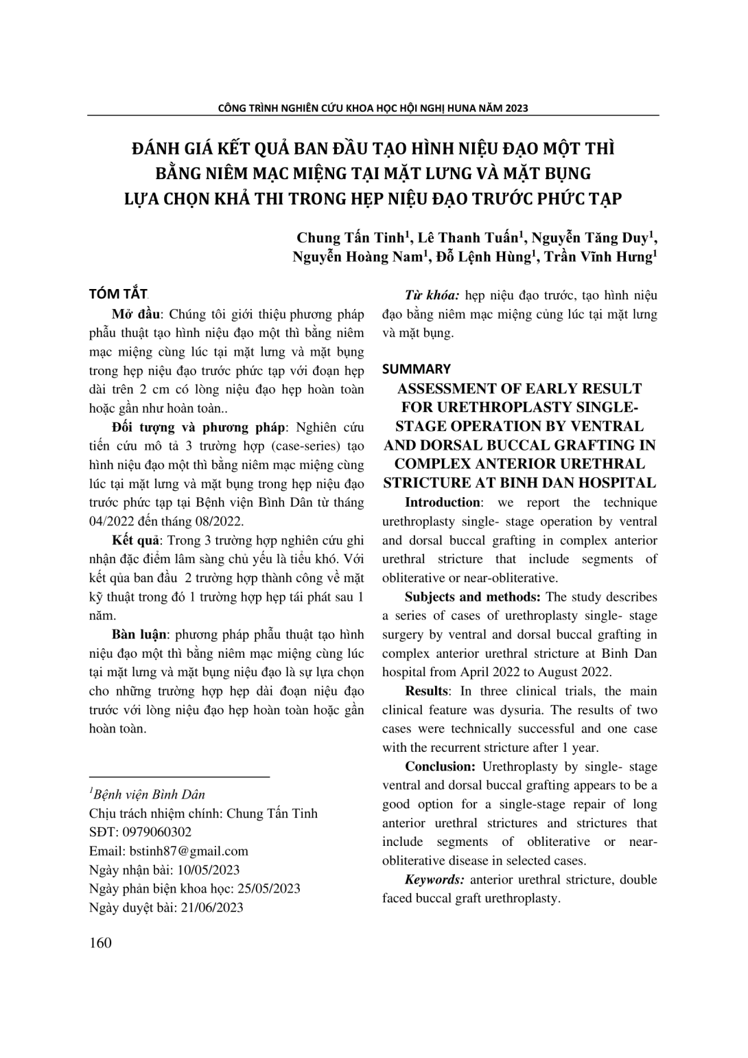 Chúng tôi giới thiệu phương pháp phẫu thuật tạo hình niệu đạo một thì bằng niêm mạc miệng cùng lúc tại mặt lưng và mặt bụng trong hẹp niệu đạo trước phức tạp với đoạn hẹp dài trên 2 cm có lòng niệu đạo hẹp hoàn toàn hoặc gần như hoàn toàn.. Đối tượng và phương pháp: Nghiên cứu tiến cứu mô tả 3 trường hợp (case-series) tạo hình niệu đạo một thì bằng niêm mạc miệng cùng lúc tại mặt lưng và mặt bụng trong hẹp niệu đạo trước phức tạp tại Bệnh viện Bình Dân từ tháng 04/2022 đến tháng 08/2022. Kết quả: Trong 3 trường hợp nghiên cứu ghi nhận đặc điểm lâm sàng chủ yếu là tiểu khó. Với kết qủa ban đầu 2 trường hợp thành công về mặt kỹ thuật trong đó 1 trường hợp hẹp tái phát sau 1 năm. Bàn luận: phương pháp phẫu thuật tạo hình niệu đạo một thì bằng niêm mạc miệng cùng lúc tại mặt lưng và mặt bụng niệu đạo là sự lựa chọn cho những trường hợp hẹp dài đoạn niệu đạo trước với lòng niệu đạo hẹp hoàn toàn hoặc gần hoàn toàn.
