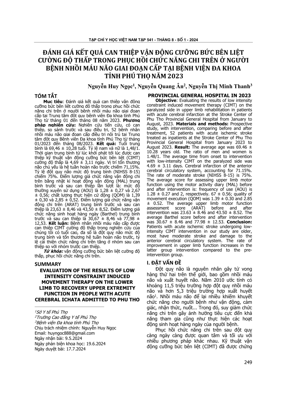Đánh giá kết quả can thiệp vận động cưỡng bức bên liệt cường độ thấp trong phục hồi chức năng chi trên ở người bệnh nhồi máu não giai đoạn cấp tại Trung tâm đột quỵ bệnh viện Đa khoa tỉnh Phú Thọ từ tháng 01 đến tháng 08 năm 2023. Phương pháp nghiên cứu: Nghiên cứu tiến cứu, có can thiệp, so sánh trước và sau điều trị, 52 bệnh nhân nhồi máu não giai đoạn cấp điều trị nội trú tại Trung tâm đột quỵ Bệnh viện Đa khoa tỉnh Phú Thọ từ tháng 01/2023 đến tháng 08/2023. Kết quả: Tuổi trung bình là 69,46 ± 10,28 tuổi. Tỷ lệ nam và nữ là 1,48/1. Thời gian trung bình từ lúc khởi phát tới lúc được can thiệp kỹ thuật vận động cưỡng bức bên liệt (CIMT) cường độ thấp là 4,69 ± 3,11 ngày. Vị trí tổn thương não chủ yếu là hệ tuần hoàn não trước chiếm 71,15%. Tỷ lệ đột quỵ não mức độ trung bình (NIHSS 8-15) chiếm 75%. Điểm lượng giá chức năng vận động chi trên bằng nhật kí hoạt động vận động (MAL) trung bình trước và sau can thiệp lần lượt là: mức độ thường xuyên sử dụng (AOU) là 1,28 ± 0,27 và 2,67 ± 0,56; chất lượng thực hiện cử động (QOM) là 1,39 ± 0,30 và 2,85 ± 0,52. Điểm lượng giá chức năng vận động chi trên (ARAT) trung bình trước và sau can thiệp là 23,63 ± 8,46 và 43,50 ± 8,52. Điểm lượng giá chức năng sinh hoạt hàng ngày (Barthel) trung bình trước và sau can thiệp là 30,67 ± 8,46 và 77,98 ± 12,53. Kết luận: Bệnh nhân nhồi máu não cấp được can thiệp CIMT cường độ thấp trong nghiên cứu của chúng tôi có tuổi cao, đa số là đột quỵ não mức độ trung bình và tổn thương hệ tuần hoàn não trước, tỷ lệ cải thiện chức năng chi trên tăng ở nhóm sau can thiệp so với nhóm trước can thiệp.