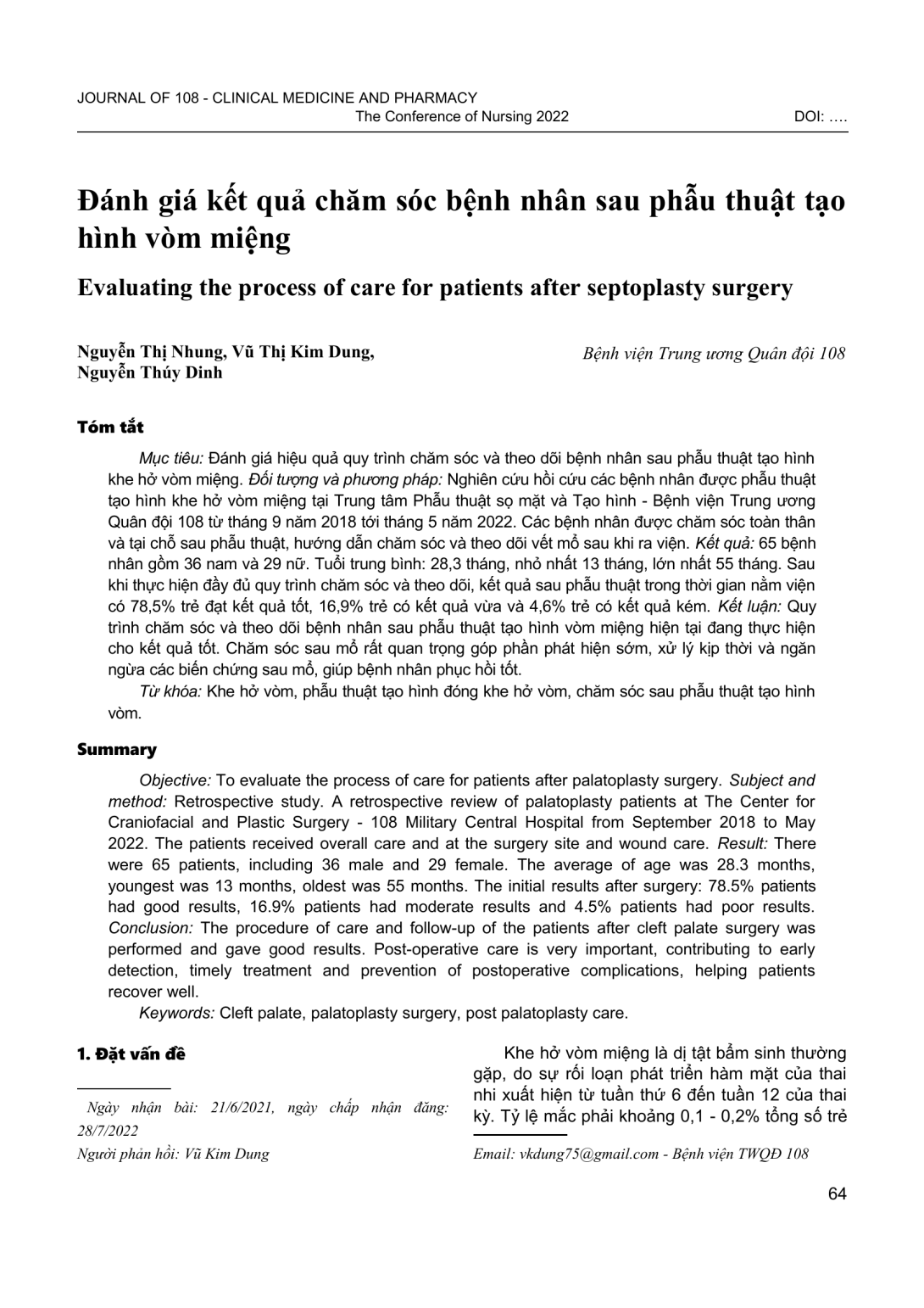 Đánh giá hiệu quả quy trình chăm sóc và theo dõi bệnh nhân sau phẫu thuật tạo hình khe hở vòm miệng. Đối tượng và phương pháp: Nghiên cứu hồi cứu các bệnh nhân được phẫu thuật tạo hình khe hở vòm miệng tại Trung tâm Phẫu thuật sọ mặt và Tạo hình - Bệnh viện Trung ương Quân đội 108 từ tháng 9 năm 2018 tới tháng 5 năm 2022. Các bệnh nhân được chăm sóc toàn thân và tại chỗ sau phẫu thuật, hướng dẫn chăm sóc và theo dõi vết mổ sau khi ra viện. Kết quả: 65 bệnh nhân gồm 36 nam và 29 nữ. Tuổi trung bình: 28,3 tháng, nhỏ nhất 13 tháng, lớn nhất 55 tháng. Sau khi thực hiện đầy đủ quy trình chăm sóc và theo dõi, kết quả sau phẫu thuật trong thời gian nằm viện có 78,5% trẻ đạt kết quả tốt, 16,9% trẻ có kết quả vừa và 4,6% trẻ có kết quả kém. Kết luận: Quy trình chăm sóc và theo dõi bệnh nhân sau phẫu thuật tạo hình vòm miệng hiện tại đang thực hiện cho kết quả tốt. Chăm sóc sau mổ rất quan trọng góp phần phát hiện sớm, xử lý kịp thời và ngăn ngừa các biến chứng sau mổ, giúp bệnh nhân phục hồi tốt.