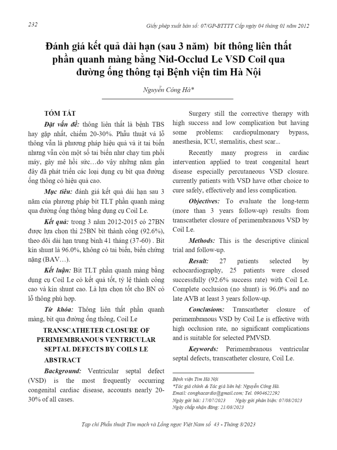 Ventricular septal defect (VSD) is the most frequently occurring congenital cardiac disease, accounts nearly 20- 30% of all cases. Surgery still the corrective therapy with high success and low complication but having some problems: cardiopulmonary bypass, anesthesia, ICU, stemalitis, chest scar... Recently many progress in cardiac intervention applied to treat congenital heart disease especially percutaneous VSD closure, currently patients with VSD have other choice to cure safely, effectively and less complication. Objectives: To evaluate the long-term (more than 3 years follow-up) results from transcatheter closure of perimembranous VSD by Coil Le. Methods: This is the descriptive clinical trial and follow-up. Result: 27 patients selected by echocardiography, 25 patients were closed successfrilly (92.6% success rate) with Coil Le. Complete occlusion (no shunt) is 96.0% and no late AVB at least 3 years follow-up. Conclusions: Transcatheter closure of perimembranous VSD by Coil Le is effective with high occlusion rate, no significant complications and is suitable for selected PMVSD.