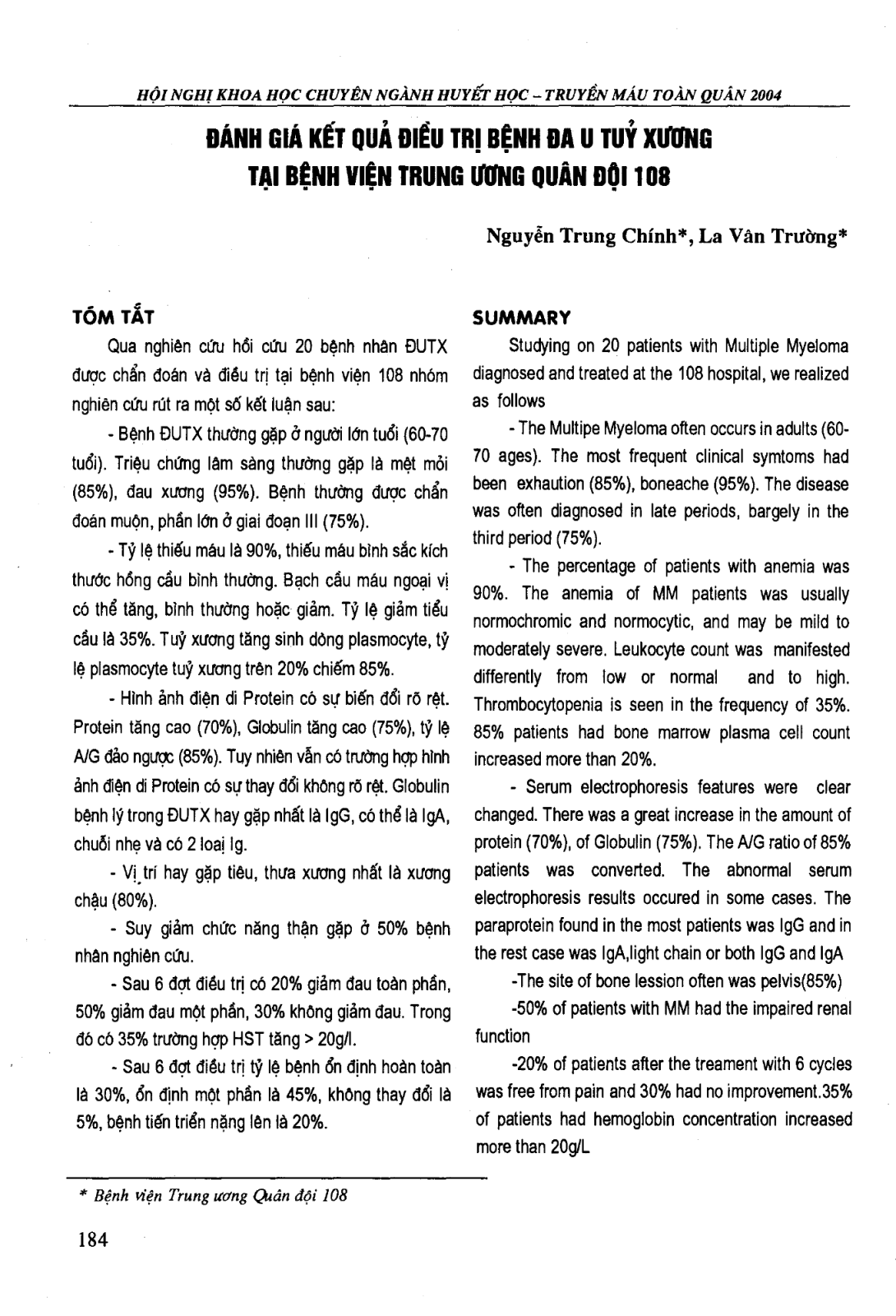 Nghiên cứu hồi cứu hồ sơ bệnh án của 20 bệnh nhân đa u tuỷ xương (ĐUTX) điều trị tại Bệnh viện 108 trong 7 năm (1995-2002). Nêu một số đặc điểm lâm sàng, cận lâm sàng của bệnh ĐUTX. Trình bày kết quả điều trị sau 6 đợt: 20% giảm đau toàn phần, 50% giảm đau một phần, 30% không giảm đau. Nồng độ HST tăng ở 75% bệnh nhân nghiên cứu, trong đó có 35% trường hợp HST tăng trên 20g/l. Sau 6 đợt điều trị, tỷ lệ bệnh ổn định hoàn toàn là 30% , ổn định một phần là 45% , không thay đổi là 5% , bệnh nặng thêm 20% .