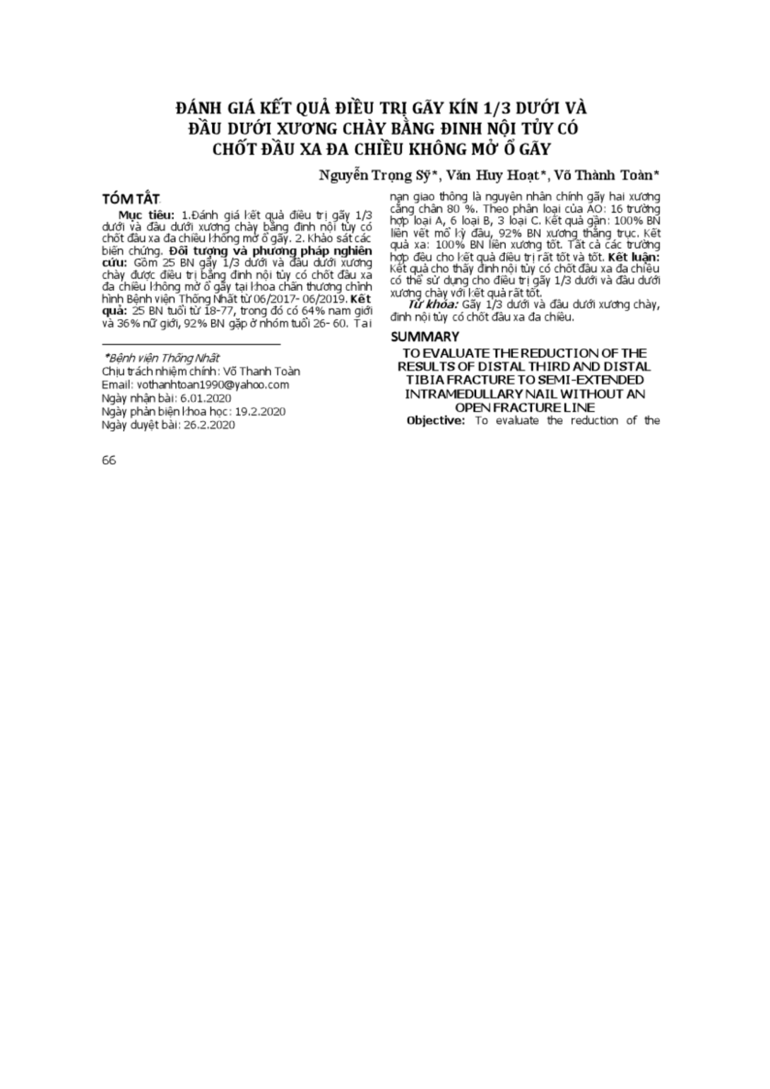 Đánh giá kết quả điều trị gãy 1/3 dưới và đầu dưới xương chày bằng đinh nội tủy có chốt đầu xa đa chiều không mở ổ gãy. Khảo sát các biến chứng. Đối tượng và phương pháp nghiên cứu Gồm 25 BN gãy 1/3 dưới và đầu dưới xương chày được điều trị bằng đinh nội tủy có chốt đầu xa đa chiều không mở ổ gãy tại khoa chấn thương chỉnh hình Bệnh viện Thống Nhất từ 06/2017- 06/2019. Kết quả 25 BN tuổi từ 18-77, trong đó có 64% nam giới và 36% nữ giới, 92% BN gặp ở nhóm tuổi 26- 60. Tai nạn giao thông là nguyên nhân chính gãy hai xương cẳng chân 80 %. Theo phân loại của AO 16 trường hợp loại A, 6 loại B, 3 loại C. Kết quả gần 100% BN liền vết mổ kỳ đầu, 92% BN xương thẳng trục. Kết quả xa 100% BN liền xương tốt. Tất cả các trường hợp đều cho kết quả điều trị rất tốt và tốt. Kết luận Kết quả cho thấy đinh nội tủy có chốt đầu xa đa chiều có thể sử dụng cho điều trị gãy 1/3 dưới và đầu dưới xương chày với kết quả rất tốt.