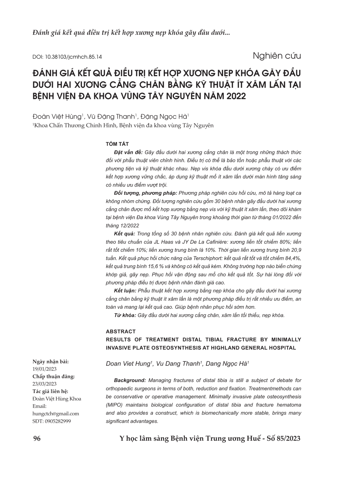 Gãy đầu dưới hai xương cẳng chân là một trong những thách thức đối với phẫu thuật viên chỉnh hình. Điều trị có thể là bảo tồn hoặc phẫu thuật với các phương tiện và kỹ thuật khác nhau. Nẹp vis khóa đầu dưới xương chày có ưu điểm kết hợp xương vững chắc, áp dụng kỹ thuật mổ ít xâm lấn dưới màn hình tăng sáng có nhiều ưu điểm vượt trội. Đối tượng, phương pháp: Phương pháp nghiên cứu hồi cứu, mô tả hàng loạt ca không nhóm chứng. Đối tượng nghiên cứu gồm 30 bệnh nhân gãy đầu dưới hai xương cẳng chân được mổ kết hợp xương bằng nẹp vis với kỹ thuật ít xâm lấn, theo dõi khám tại bệnh viện Đa khoa Vùng Tây Nguyên trong khoảng thời gian từ tháng 01/2022 đến tháng 12/2022 Kết quả: Trong tổng số 30 bệnh nhân nghiên cứu. Đánh giá kết quả liền xương theo tiêu chuẩn của JL Haas và JY De La Cafinière: xương liền tốt chiếm 80%; liền rất tốt chiếm 10%; liền xương trung bình là 10%. Thời gian liền xương trung bình 20,9 tuần. Kết quả phục hồi chức năng của Terschiphort: kết quả rất tốt và tốt chiếm 84,4%, kết quả trung bình 15,6 % và không có kết quả kém. Không trường hợp nào biến chứng khớp giả, gãy nẹp. Phục hồi vận động sau mổ cho kết quả tốt. Sự hài lòng đối với phương pháp điều trị được bệnh nhân đánh giá cao. Kết luận: Phẫu thuật kết hợp xương bằng nẹp khóa cho gãy đầu dưới hai xương cẳng chân bằng kỹ thuật ít xâm lấn là một phương pháp điều trị rất nhiều ưu điểm, an toàn và mang lại kết quả cao. Giúp bệnh nhân phục hồi sớm hơn.