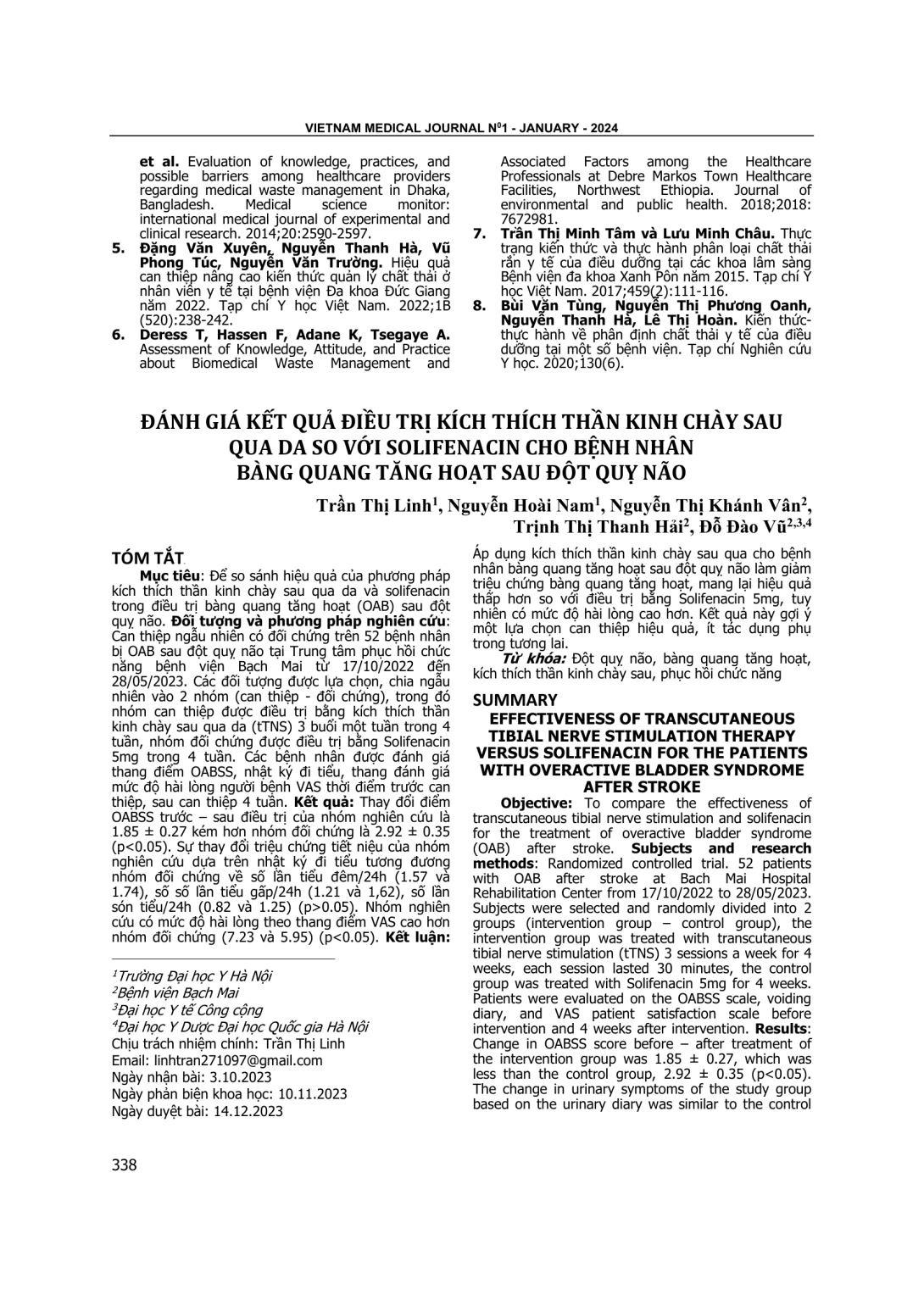 To compare the effectiveness of transcutaneous tibial nerve stimulation and solifenacin for the treatment of overactive bladder syndrome (OAB) after stroke. Subjects and research methods: Randomized controlled trial. 52 patients with OAB after stroke at Bach Mai Hospital Rehabilitation Center from 17/10/2022 to 28/05/2023. Subjects were selected and randomly divided into 2 groups (intervention group – control group), the intervention group was treated with transcutaneous tibial nerve stimulation (tTNS) 3 sessions a week for 4 weeks, each session lasted 30 minutes, the control group was treated with Solifenacin 5mg for 4 weeks. Patients were evaluated on the OABSS scale, voiding diary, and VAS patient satisfaction scale before intervention and 4 weeks after intervention. Results: Change in OABSS score before – after treatment of the intervention group was 1.85 ± 0.27, which was less than the control group, 2.92 ± 0.35 (p<0.05). The change in urinary symptoms of the study group based on the urinary diary was similar to the control group including nocturia/24 hours (1.57 and 1.74), urgency/24 hours (1.21 and 1.62). urge incontinence/24h (0.82 and 1.25) (p>0.05). The intervention group had a higher level of satisfaction according to the VAS scale than the control group (7.23 and 5.95) (p<0.05). Conclusion: Applying tTNS for patients with overactive bladder after stroke reduces symptoms of overactive bladder, has less effectiveness than treatment with Solifenacin 5mg, but has better level of satisfaction. tTNS may be an effective option for the treatment of OAB after stroke with few side effects.