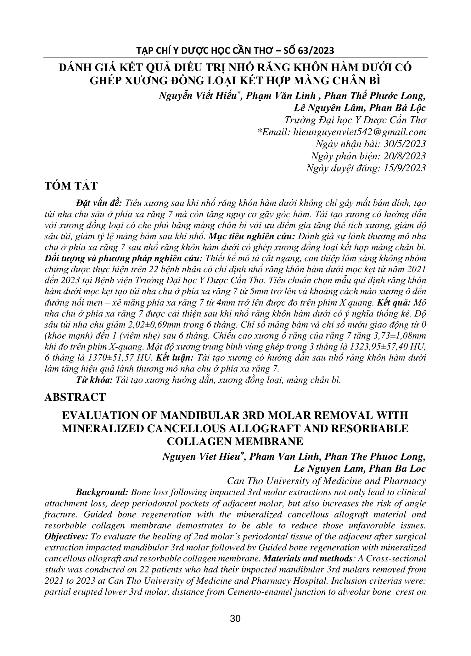 Tiêu xương sau khi nhổ răng khôn hàm dưới không chỉ gây mất bám dính, tạo túi nha chu sâu ở phía xa răng 7 mà còn tăng nguy cơ gãy góc hàm. Tái tạo xương có hướng dẫn với xương đồng loại có che phủ bằng màng chân bì với ưu điểm gia tăng thể tích xương, giảm độ sâu túi, giảm tỷ lệ mảng bám sau khi nhổ. Đánh giá sự lành thương mô nha chu ở phía xa răng 7 sau nhổ răng khôn hàm dưới có ghép xương đồng loại kết hợp màng chân bì. Thiết kế mô tả cắt ngang, can thiệp lâm sàng không nhóm chứng được thực hiện trên 22 bệnh nhân có chỉ định nhổ răng khôn hàm dưới mọc kẹt từ năm 2021 đến 2023 tại Bệnh viện Trường Đại học Y Dược Cần Thơ. Tiêu chuẩn chọn mẫu qui định răng khôn hàm dưới mọc kẹt tạo túi nha chu ở phía xa răng 7 từ 5mm trở lên và khoảng cách mào xương ổ đến đường nối men – xê măng phía xa răng 7 từ 4mm trở lên được đo trên phim X quang. Mô nha chu ở phía xa răng 7 được cải thiện sau khi nhổ răng khôn hàm dưới có ý nghĩa thống kê. Độ sâu túi nha chu giảm 2,02±0,69mm trong 6 tháng. Chỉ số mảng bám và chỉ số nướu giao động từ 0 (khỏe mạnh) đến 1 (viêm nhẹ) sau 6 tháng. Chiều cao xương ổ răng của răng 7 tăng 3,73±1,08mm khi đo trên phim X-quang. Mật độ xương trung bình vùng ghép trong 3 tháng là 1323,95±57,40 HU, 6 tháng là 1370±51,57 HU. Tái tạo xương có hướng dẫn sau nhổ răng khôn hàm dưới làm tăng hiệu quả lành thương mô nha chu ở phía xa răng 7.