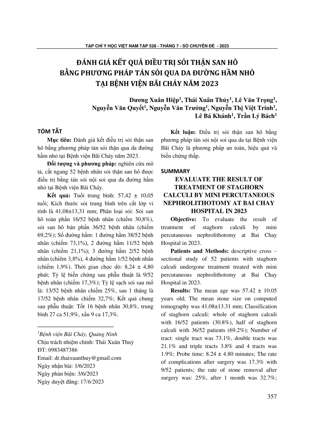 Đánh giá kết điều trị sỏi thận san hô bằng phương pháp tán sỏi thận qua da đường hầm nhỏ tại Bệnh viện Bãi Cháy năm 2023. Đối tượng và phương pháp: nghiên cứu mô tả, cắt ngang 52 bệnh nhân sỏi thận san hô được điều trị bằng tán sỏi nội soi qua da đường hầm nhỏ tại Bệnh viện Bãi Cháy. Kết quả: Tuổi trung bình: 57,42 ± 10,05 tuổi; Kích thước sỏi trung bình trên cắt lớp vi tính là 41,08±13,31 mm; Phân loại sỏi: Sỏi san hô toàn phần 16/52 bệnh nhân (chiếm 30,8%), sỏi san hô bán phần 36/52 bệnh nhân (chiếm 69,2%); Số đường hầm: 1 đường hầm 38/52 bệnh nhân (chiếm 73,1%), 2 đường hầm 11/52 bệnh nhân (chiếm 21,1%); 3 đường hầm 2/52 bệnh nhân (chiêm 3,8%), 4 đường hầm 1/52 bệnh nhân (chiếm 1,9%). Thời gian chọc dò: 8,24 ± 4,80 phút; Tỷ lệ biến chứng sau phẫu thuật là 9/52 bệnh nhân (chiếm 17,3%); Tỷ lệ sạch sỏi sau mổ là: 13/52 bệnh nhân chiếm 25%, sau 1 tháng là 17/52 bệnh nhân chiếm 32,7%; Kết quả chung sau phẫu thuật: Tốt 16 bệnh nhân 30,8%, trung bình 27 ca 51,9%, xấu 9 ca 17,3%. Kết luận: Điều trị sỏi thận san hô bằng phương pháp tán sỏi nội soi qua da tại Bệnh viện Bãi Cháy là phương pháp an toàn, hiệu quả và biến chứng thấp.