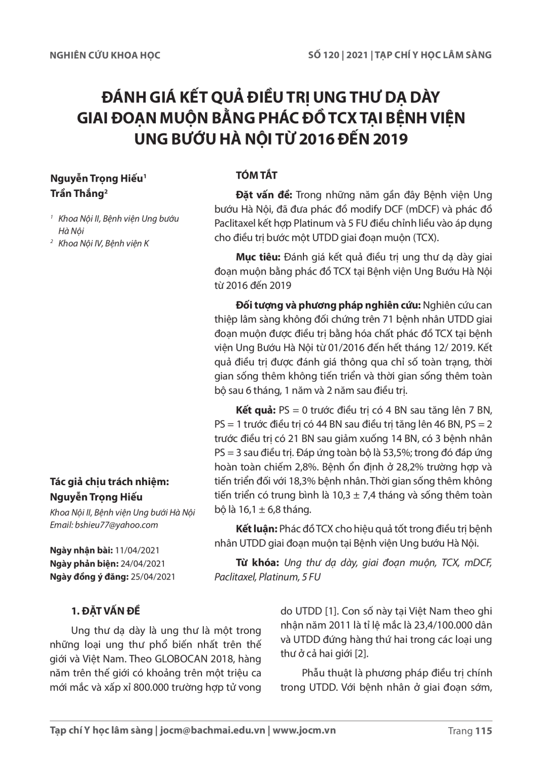 Trong những năm gần đây Bệnh viện Ung bướu Hà Nội, đã đưa phác đồ modiAy DCF (mDCF) và phác đồ Paclitaxel kết hợp Platinum và 5 FU điều chỉnh liều vào áp dụng cho điều trị bước một UTDD giai đoạn muộn (TCX). Mục tiêu: Đánh giá kết quả điều trị ung thư dạ dày giai đoạn muộn bằng phác đồ TCX tại Bệnh viện Ung Bướu Hà Nội từ 2016 đến 2019.Đối tượng và phương pháp nghiên cứu: Nghiên cứu can thiệp lâm sàng không đối chứng trên 71 bệnh nhân UTDD giai đoạn muộn được điều trị bằng hóa chất phác đồ TCX tại bệnh viện Ung Bướu Hà Nội từ 01/2016 đến hết tháng 12/ 2019. Kết quả điều trị được đánh giá thông qua chỉ số toàn trạng, thời gian sống thêm không tiến triển và thời gian sống thêm toàn bộ sau 6 tháng, 1 năm và 2 năm sau điều trị.Kết quả: PS = 0 trước điều trị có 4 BN sau tăng lên 7 BN, PS = 1 trước điều trị có 44 BN sau điều trị tăng lên 46 BN, PS = 2 trước điều trị có 21 BN sau giảm xuống 14 BN, có 3 bệnh nhân PS = 3 sau điều trị. Đáp ứng toàn bộ là 53,5%; trong đó đáp ứng hoàn toàn chiếm 2,8%. Bệnh ổn định ở 28,2% trường hợp và tiến triển đối với 18,3% bệnh nhân. Thời gian sống thêm không tiến triển có trung bình là 10,3 ± 7,4 tháng và sống thêm toàn bộ là 16,1 ± 6,8 tháng. Kết luận: Phác đồ TCX cho hiệu quả tốt trong điều trị bệnh nhân UTDD giai đoạn muộn tại Bệnh viện Ung bướu Hà Nội.