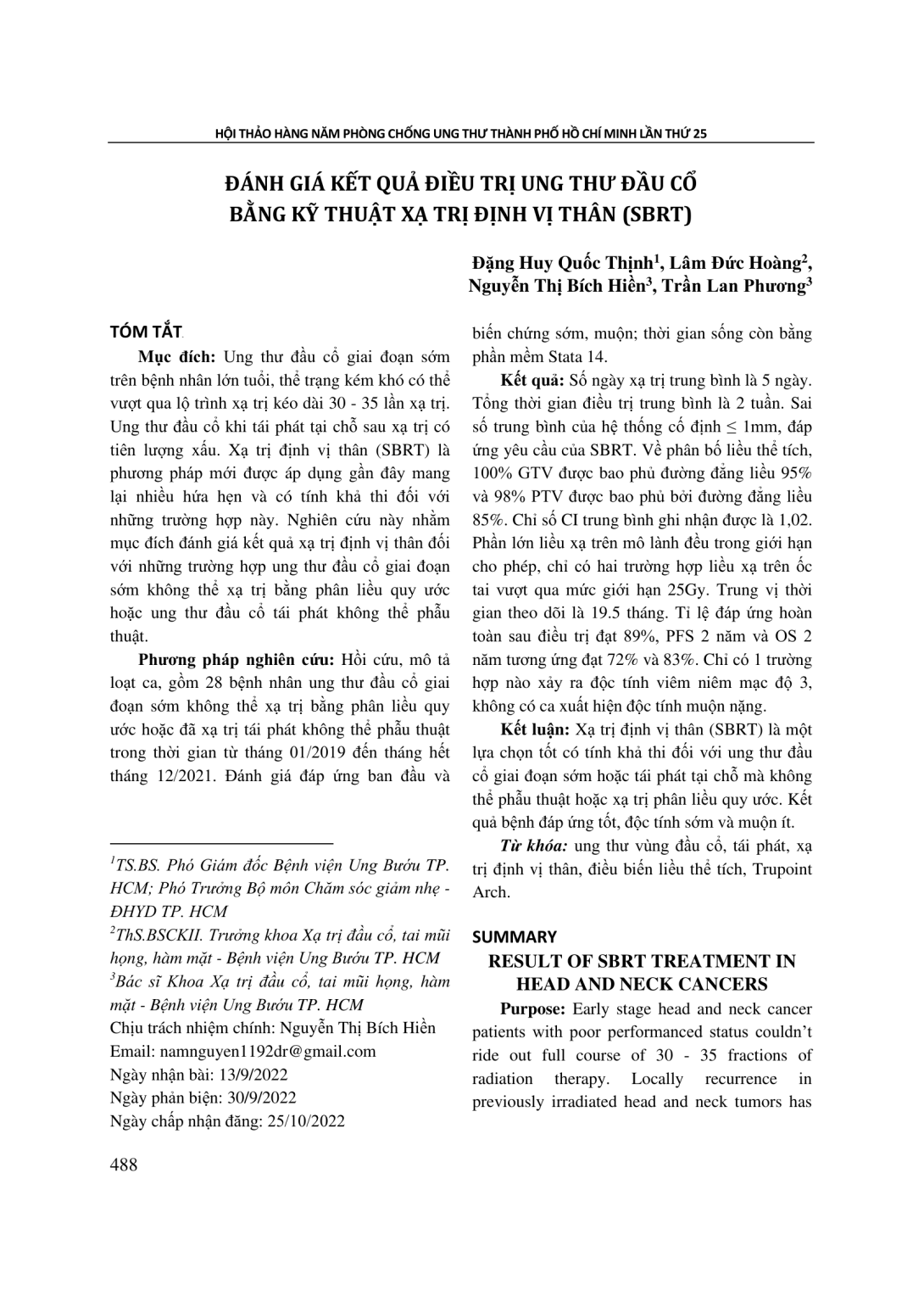 Ung thư đầu cổ giai đoạn sớm trên bệnh nhân lớn tuổi, thể trạng kém khó có thể vượt qua lộ trình xạ trị kéo dài 30 - 35 lần xạ trị. Ung thư đầu cổ khi tái phát tại chỗ sau xạ trị có tiên lượng xấu. Xạ trị định vị thân (SBRT) là phương pháp mới được áp dụng gần đây mang lại nhiều hứa hẹn và có tính khả thi đối với những trường hợp này. Nghiên cứu này nhằm mục đích đánh giá kết quả xạ trị định vị thân đối với những trường hợp ung thư đầu cổ giai đoạn sớm không thể xạ trị bằng phân liều quy ước hoặc ung thư đầu cổ tái phát không thể phẫu thuật. Phương pháp nghiên cứu: Hồi cứu, mô tả loạt ca, gồm 28 bệnh nhân ung thư đầu cổ giai đoạn sớm không thể xạ trị bằng phân liều quy ước hoặc đã xạ trị tái phát không thể phẫu thuật trong thời gian từ tháng 01/2019 đến tháng hết tháng 12/2021. Đánh giá đáp ứng ban đầu và biến chứng sớm, muộn; thời gian sống còn bằng phần mềm Stata 14. Kết quả: Số ngày xạ trị trung bình là 5 ngày. Tổng thời gian điều trị trung bình là 2 tuần. Sai số trung bình của hệ thống cố định ≤ 1mm, đáp ứng yêu cầu của SBRT. Về phân bố liều thể tích, 100% GTV được bao phủ đường đẳng liều 95% và 98% PTV được bao phủ bởi đường đẳng liều 85%. Chỉ số CI trung bình ghi nhận được là 1,02. Phần lớn liều xạ trên mô lành đều trong giới hạn cho phép, chỉ có hai trường hợp liều xạ trên ốc tai vượt qua mức giới hạn 25Gy. Trung vị thời gian theo dõi là 19.5 tháng. Tỉ lệ đáp ứng hoàn toàn sau điều trị đạt 89%, PFS 2 năm và OS 2 năm tương ứng đạt 72% và 83%. Chỉ có 1 trường hợp nào xảy ra độc tính viêm niêm mạc độ 3, không có ca xuất hiện độc tính muộn nặng. Kết luận: Xạ trị định vị thân (SBRT) là một lựa chọn tốt có tính khả thi đối với ung thư đầu cổ giai đoạn sớm hoặc tái phát tại chỗ mà không thể phẫu thuật hoặc xạ trị phân liều quy ước. Kết quả bệnh đáp ứng tốt, độc tính sớm và muộn ít.