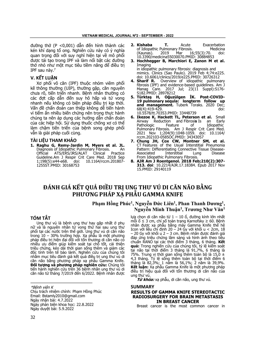 Ung thư vú là bệnh ung thư hay gặp nhất ở phụ nữ và là nguyên nhân tử vong thứ hai sau ung thư phổi tại các nước trên thế giới. Ung thư vú di căn não trong 10 – 30% trường hợp. Xạ phẫu là một phương pháp điều trị hiện đại đối với tổn thương di căn não có nhiều ưu điểm giúp kiểm soát tại chỗ tốt, cải thiện triệu chứng, kéo dài thời gian sống thêm và giảm các độc tính trên tế bào lành. Nghiên cứu của chúng tôi nhằm mục tiêu đánh giá kết quả điều trị ung thư vú di căn não bằng phương pháp xạ phẫu Gamma Knife. Đối tượng và phương pháp nghiên cứu: Chúng tôi tiến hành nghiên cứu trên 36 bệnh nhân ung thư vú di căn não từ tháng 7/2019 đến 6/2022. Bệnh nhân được mỗi ổ ≤ 3 cm, chỉ số toàn trạng Karnofsky ≥ 60. Bệnh nhân được xạ phẫu bằng máy Gamma Knife thế hệ Icon với liều chỉ định 20 – 24 Gy với khối u < 2cm, 18 – 20 Gy với khối u 2 – 3 cm. Bệnh nhân được đánh giá đáp ứng triệu chứng lâm sàng và hình ảnh theo tiêu chuẩn RANO tại các thời điểm 3 tháng, 6 tháng. Kết quả: Trong nghiên cứu của chúng tôi, tỷ lệ kiểm soát tại não tại thời điểm 3 tháng là 91,7%, 6 tháng là 75%. Trung vị thời gian sống thêm toàn bộ là 15,0 ± 4,3 tháng. Tỷ lệ sống thêm toàn bộ tại thời điểm 6 tháng là 82,3%; 1 năm là 56,1%; 2 năm là 39,9%. Kết luận: Xạ phẫu Gamma Knife là một phương pháp điều trị hiệu quả đối với tổn thương di căn não của ung thư vú.